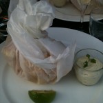 Qu’en est-il quelques années plus tard? Le lieu mérite t-il toujours sa réputation flatteuse ? C’est donc ce que nous sommes allés vérifier en allant y diner. Installé en terrasse, la vue sur la petite ceinture est très étonnante. Les canapés sont très confortables. Le menu nous est présenté sous forme d’une feuille pliée en quatre. On se laisse finalement tenté par Fish and Chips, le plat typiquement britannique revisité par Senderens. L’état d’esprit Fast Food est bien retranscrit par l’emballage en papier. Le plat est bon même s’il est un peu gras. Les frites maisons sont agréables. Le vin blanc de Gascogne est très fruité.