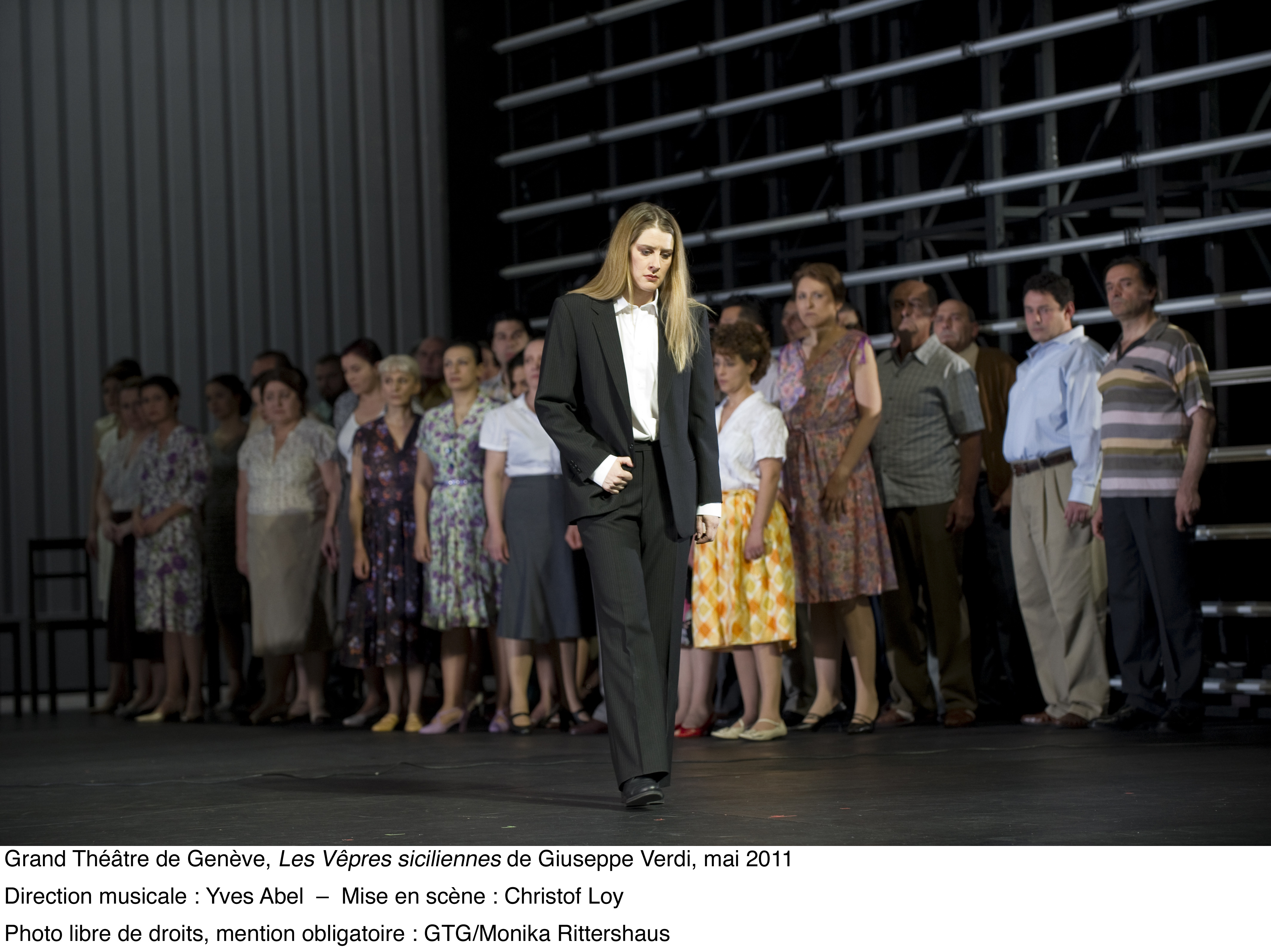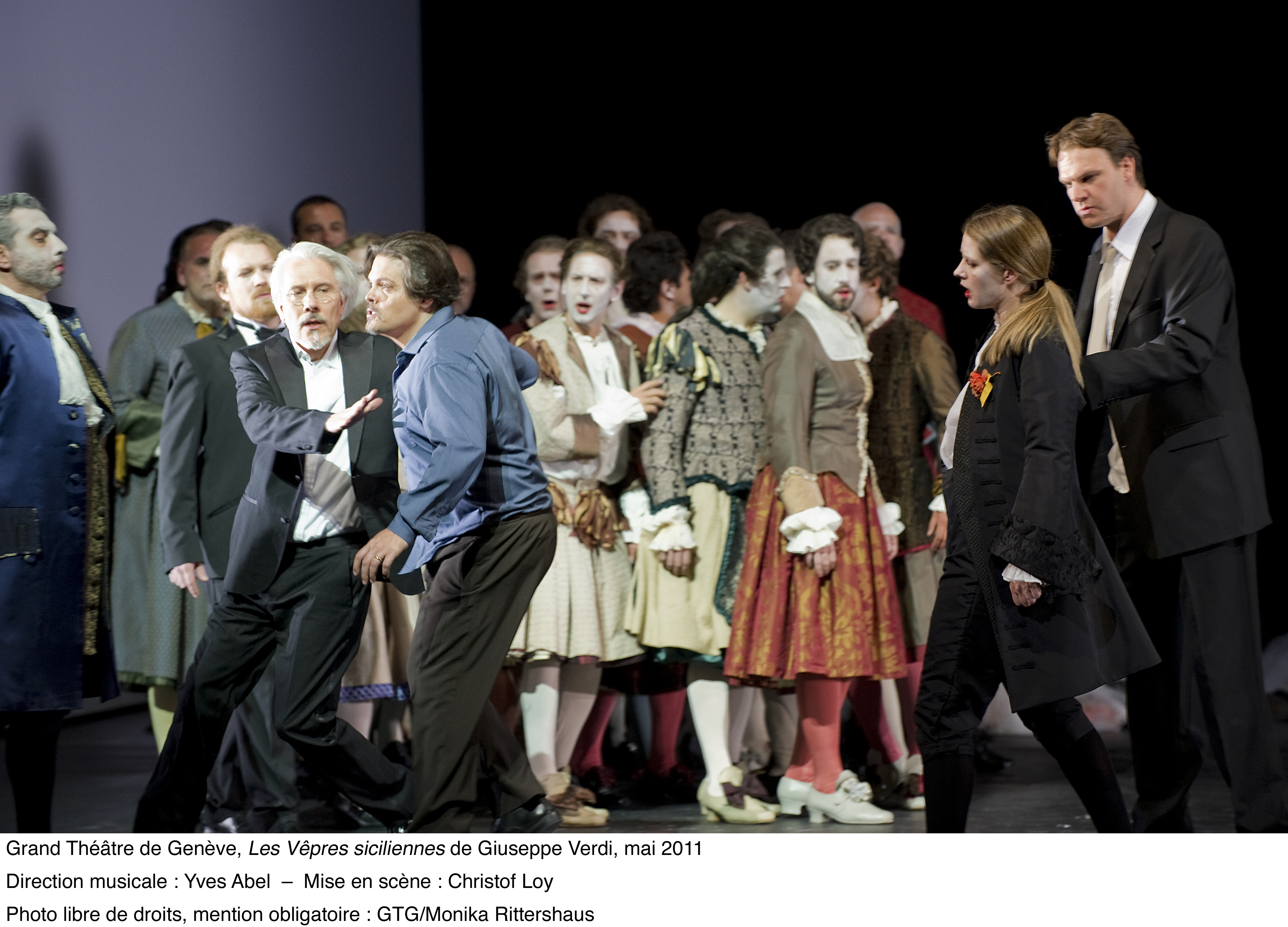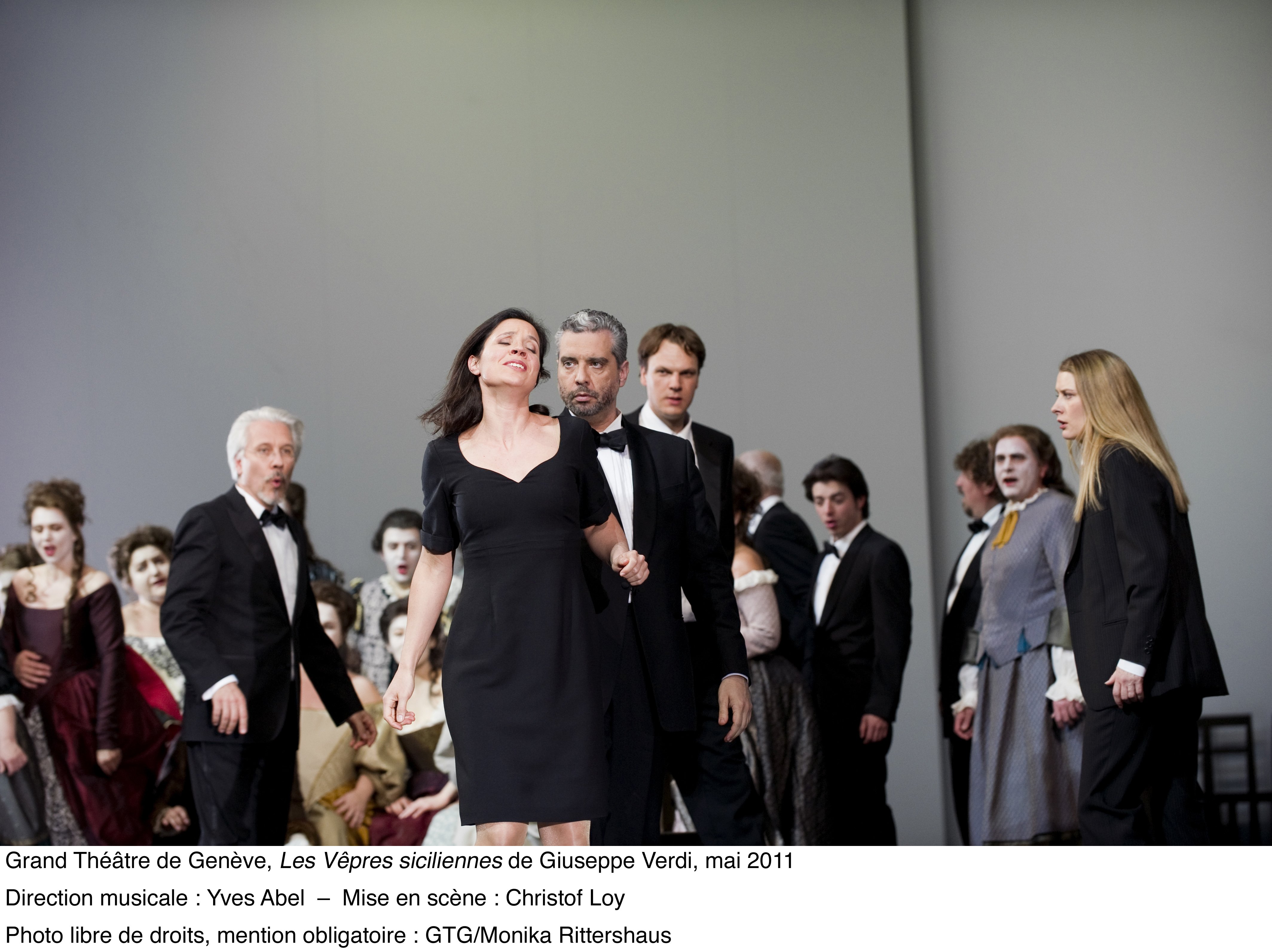 ed ai suoi “400 coups” . Bellissime le scenografie di Johannes Leiaker ed i costumi di Ursula Rezenbrink nonché le coreografie di Thomas Wilhelm e le proiezioni video di Evita Galanou e Thomas Wollenberger . Nei ruoli principali Malyn Bystrom (Hélène), Fernando Portari (Henri), Tassis Christyannis (Guy de Monfort), Balint Szabo (Procida) . Tra le numerose comparse in scena si segnalavano Solange Amstutz e Olga Gorbounova . Fenomenale la prestazione del Coro