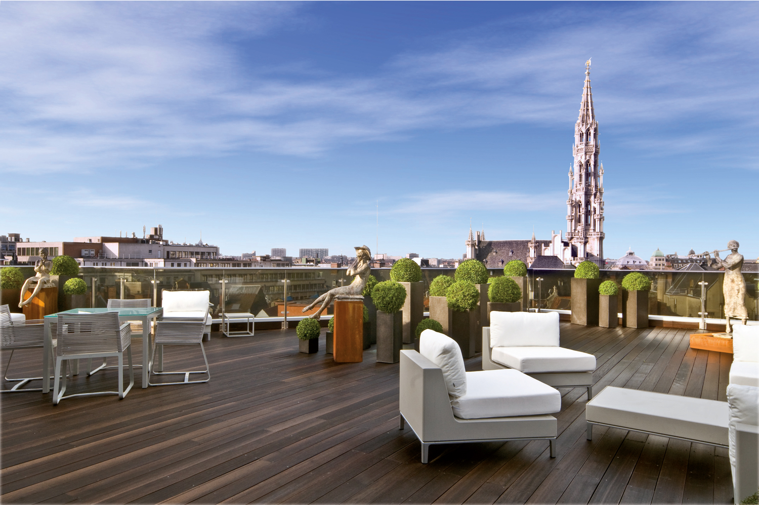 Face à l’ample espace réunissant salons et salles à manger se déploie la terrasse panoramique. Invitation irrésistible à franchir la baie vitrée que rend plus légitime encore un mobilier choisi, les sculptures en bronze parmi les buis et la vue sur le cœur de Bruxelles. Celle-ci est unique sur les toits historiques couronnés de statues d’or de la Grand Place.