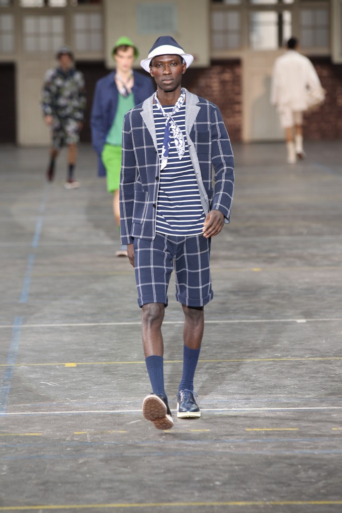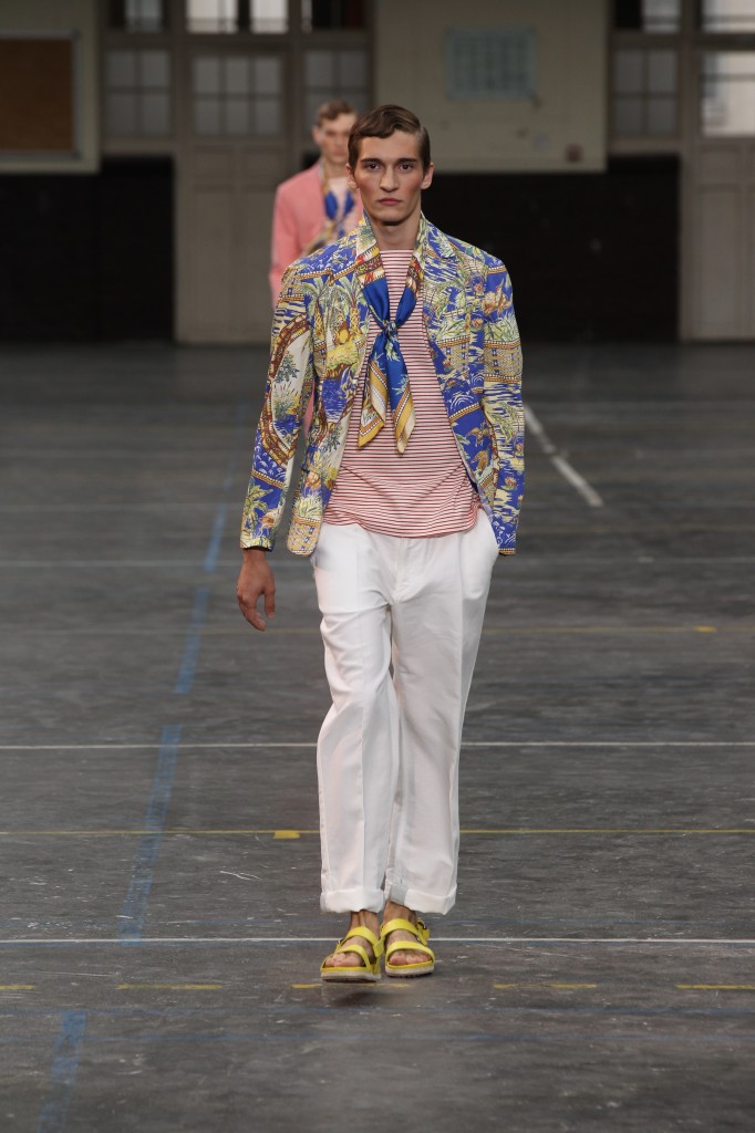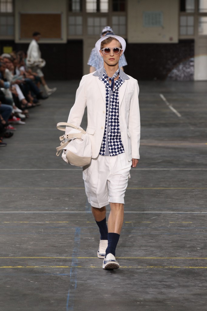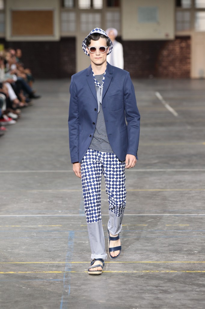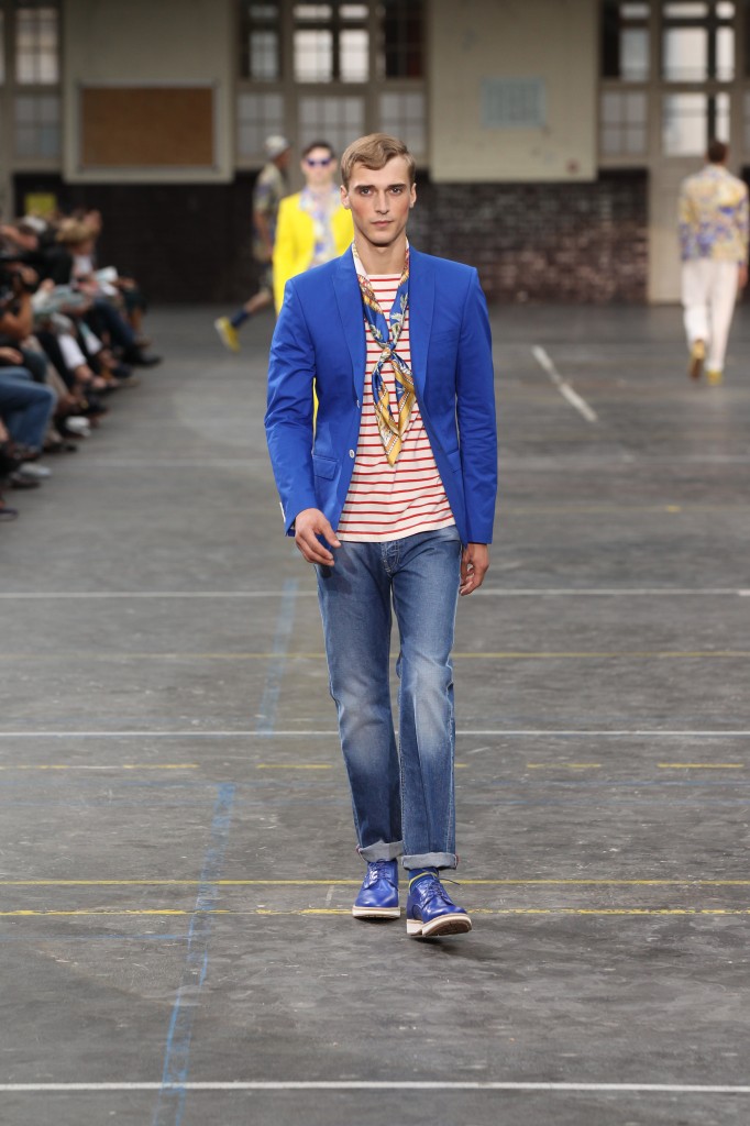 Dès le début du défilé, le ton est donné ; les premières notes des Beach Boys s’égrènent, nous voici en vacances. Il est temps de lâcher prise et d’abandonner nos vêtements ternes et étriqués pour revêtir nos costumes colorés de joyeux vacanciers. L’Homme Kenzo se veut explorateur et met son costume de marin : pantalon blanc, bermuda ou jean à revers de rigueur et marinière aux rayures rouges ou noires remise au goût du jour.