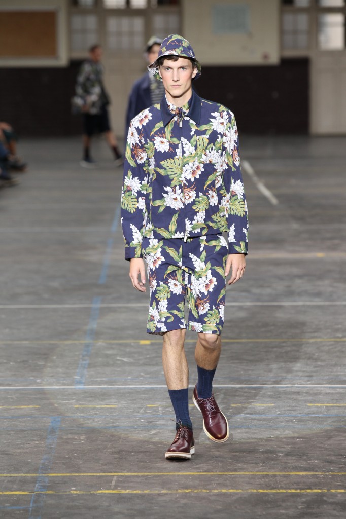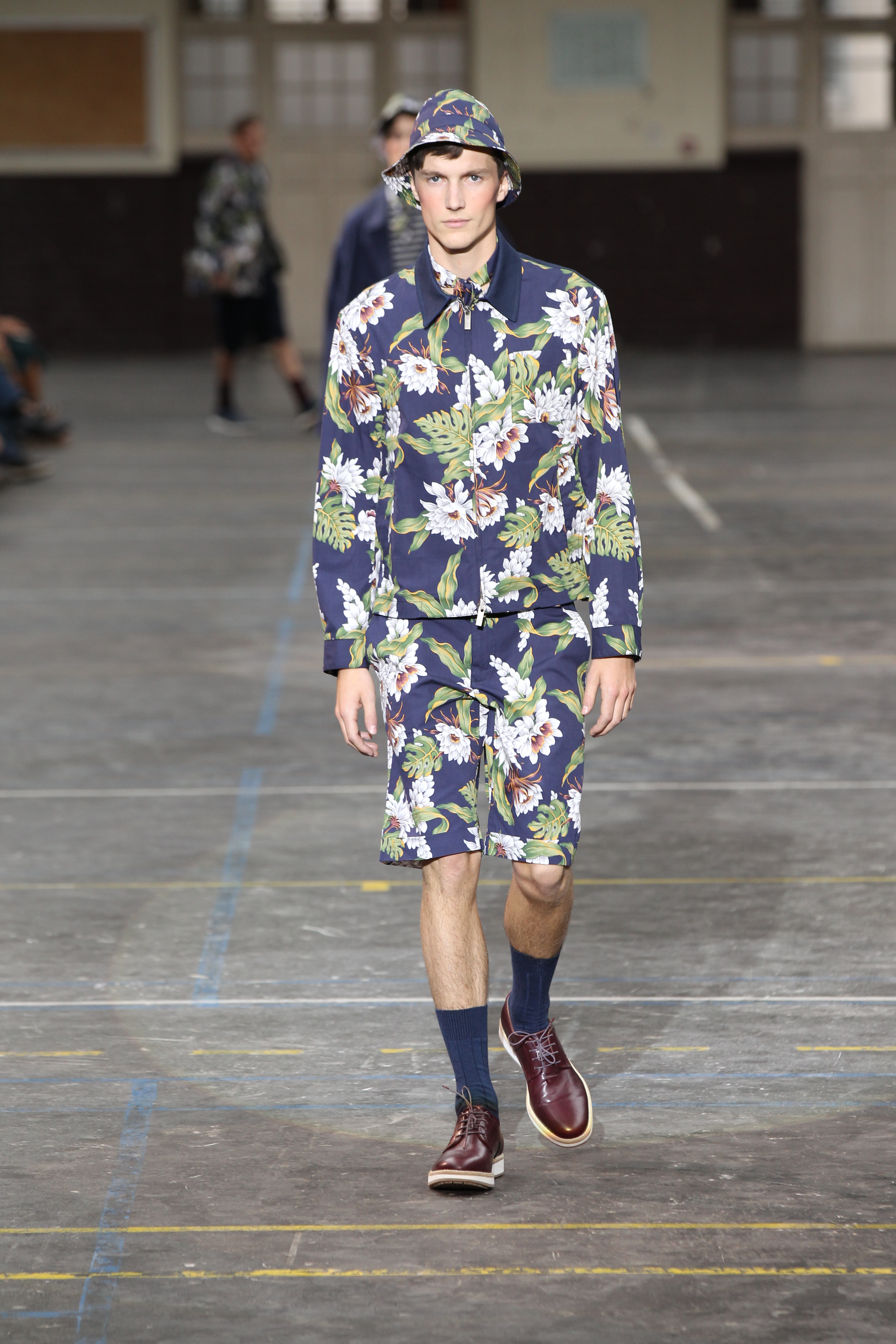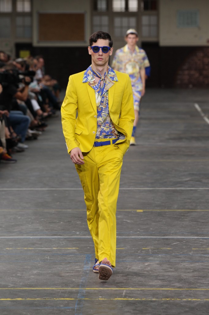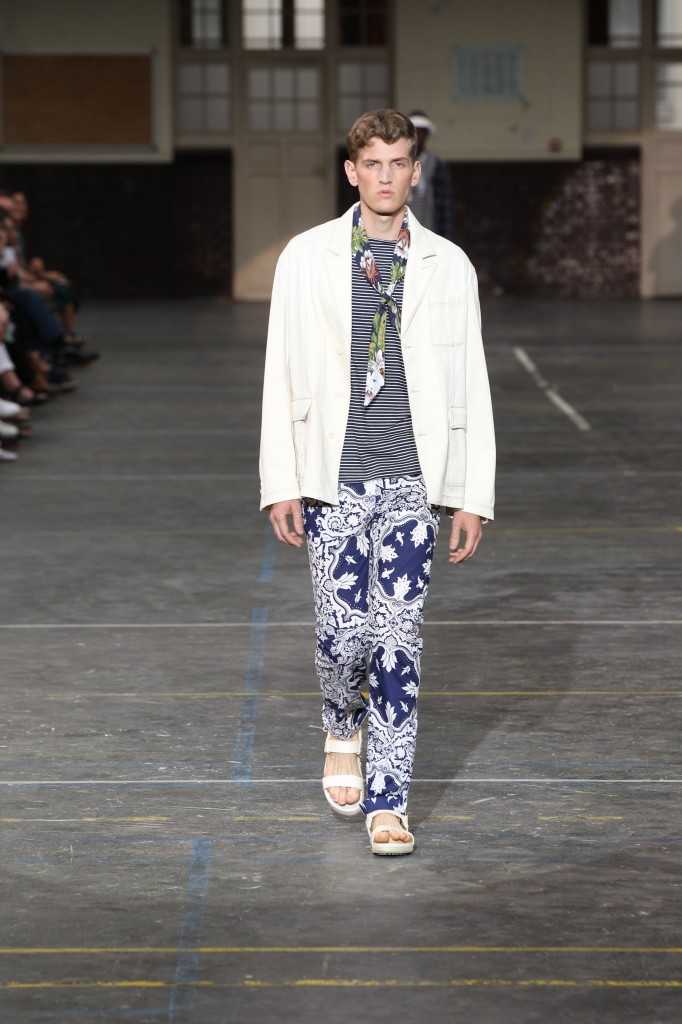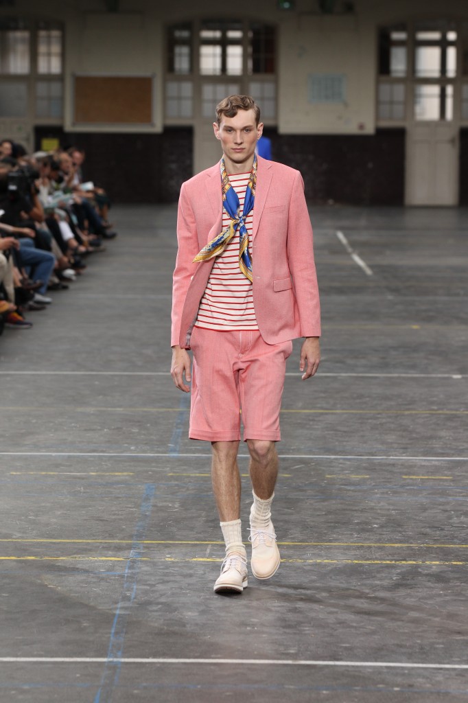 Dès le début du défilé, le ton est donné ; les premières notes des Beach Boys s’égrènent, nous voici en vacances. Il est temps de lâcher prise et d’abandonner nos vêtements ternes et étriqués pour revêtir nos costumes colorés de joyeux vacanciers. L’Homme Kenzo se veut explorateur et met son costume de marin : pantalon blanc, bermuda ou jean à revers de rigueur et marinière aux rayures rouges ou noires remise au goût du jour.