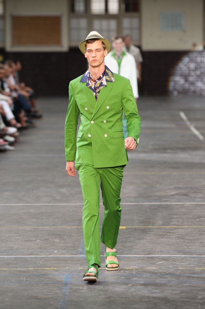 Il arbore des bobs coordonnés aux costumes imprimés et marche d’un pas nonchalant dans des sandales en cuir à double passant. Chaussures fermées mais néanmoins colorées riment avec chaussettes hautes. Le foulard est de rigueur noué de manière lâche autour du cou. Le sac ne se porte plus à bandoulière mais à bout de bras en guise de pochette. La chevelure est crantée.