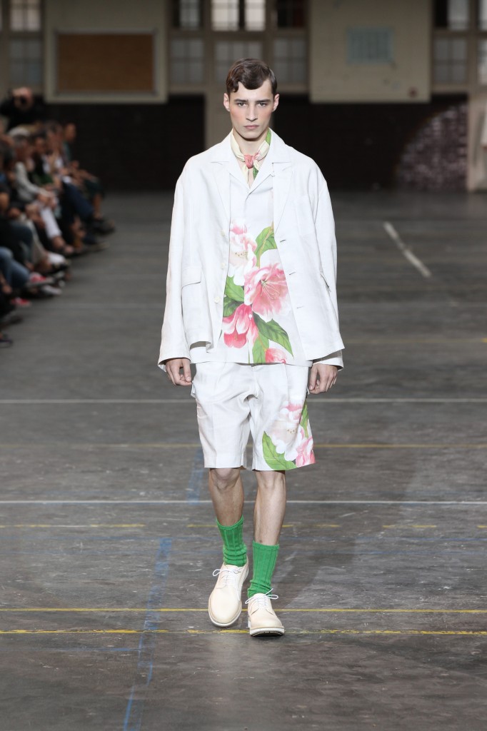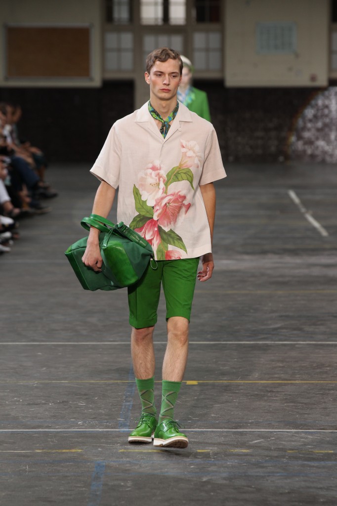 L’imprimé floral si cher à la maison Kenzo n’est pas oublié. On le retrouve peint à la main sur des chemises en soie à la coupe un peu large. Les rayures et les carreaux font un pas de deux et le pois ponctue des silhouettes légères et estivales.