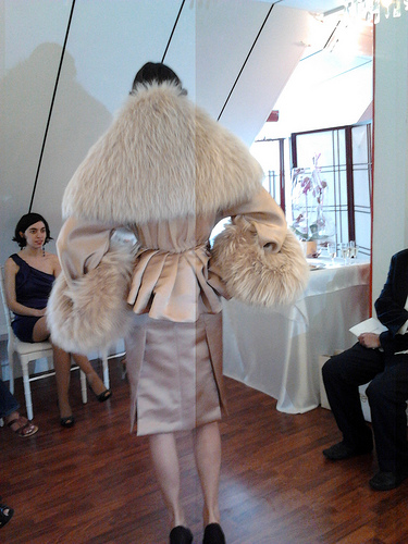 Diane : With a generous fur collar and satin leather pleated vest in the back and a pencil skirt, this creation looks like it came right off a 1940’s magazine cover. All she’s missing is the cigarette stem and a few giant diamond rings :