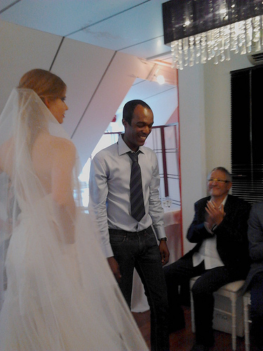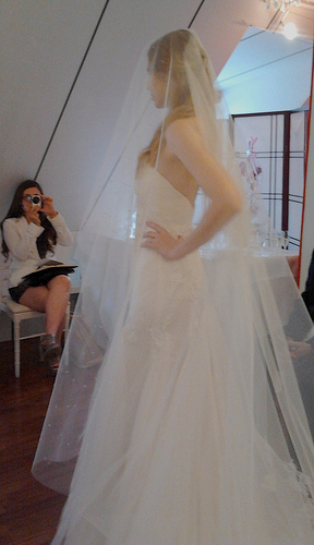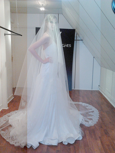 The bride : Ivory silk satin with pleated quills of tulle, and a draped tulle and lace bustier and a veil bordered by crystals and lace… this bride is full of grace.