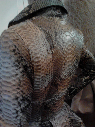 Iris : Jacket in python and pencil skirt in satin silk and leather. I like the cinched waist and the skirted jacket with the tight fitting pencil skirt. A classic and classy silhouette. The python makes it feel a bit more modern and edgy :