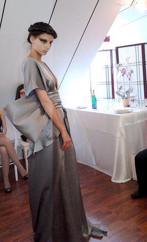 Luna : A kimono inspired long dress in a iridescent gray satin silk. So, the big bow is back huh? :