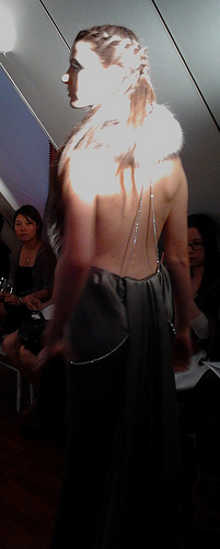 Aurore : Silver fox fur collar, with a silk skirt that is embellished with swaroswki crystals. I can image how soft that fur must feel against the bare skin….. This piece seems almost to lean towards racy with is non-existant back and revealing front. It brings the collection to a full circle of variety! :