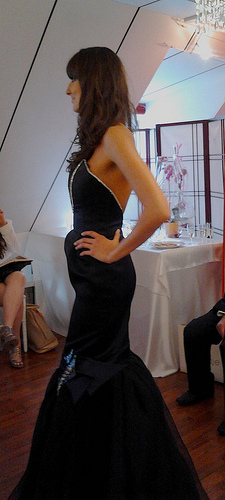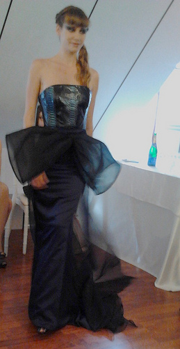 Venilia : A bustier dress in dark gray silk satin and swaroswki crystals. A wide mermaid cut on the skirt and a slight scrunch just below the waist in front gives this gown a look that is très à la mode :