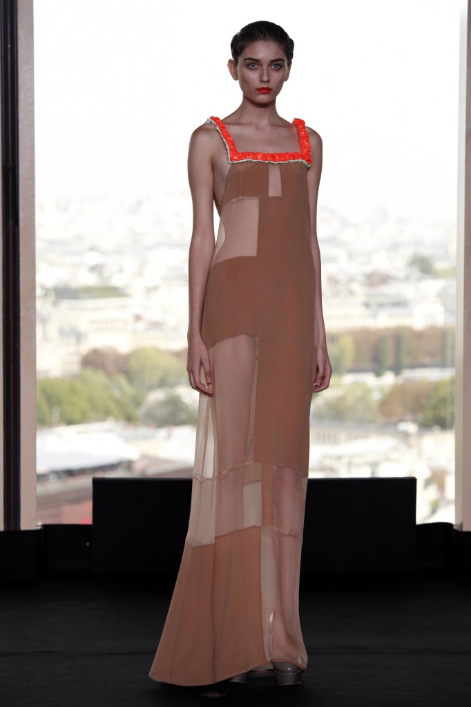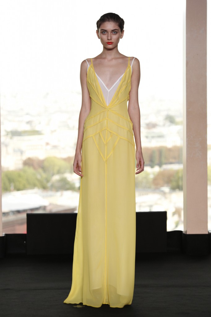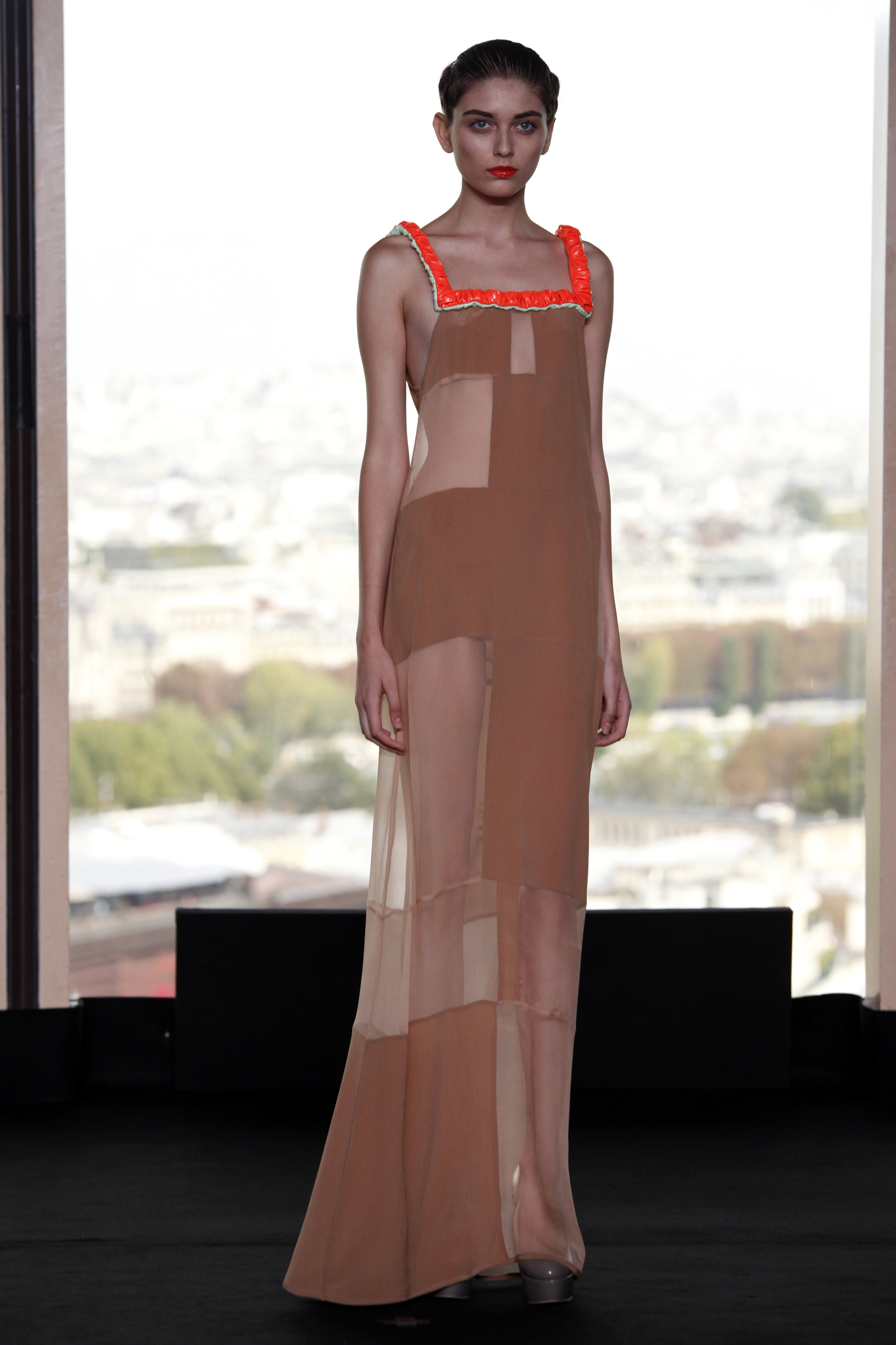 Au premier étage de la Tour Eiffel et devant un public conquis, des tenues d’une extrême délicatesse se succèdent sur fond de vue sur les toits de Paris. Chaque pièce est une véritable ode à la légèreté mais aussi l’expression d’une sensuelle féminité. Les décolletés sont profonds, la silhouette est magnifiée.
