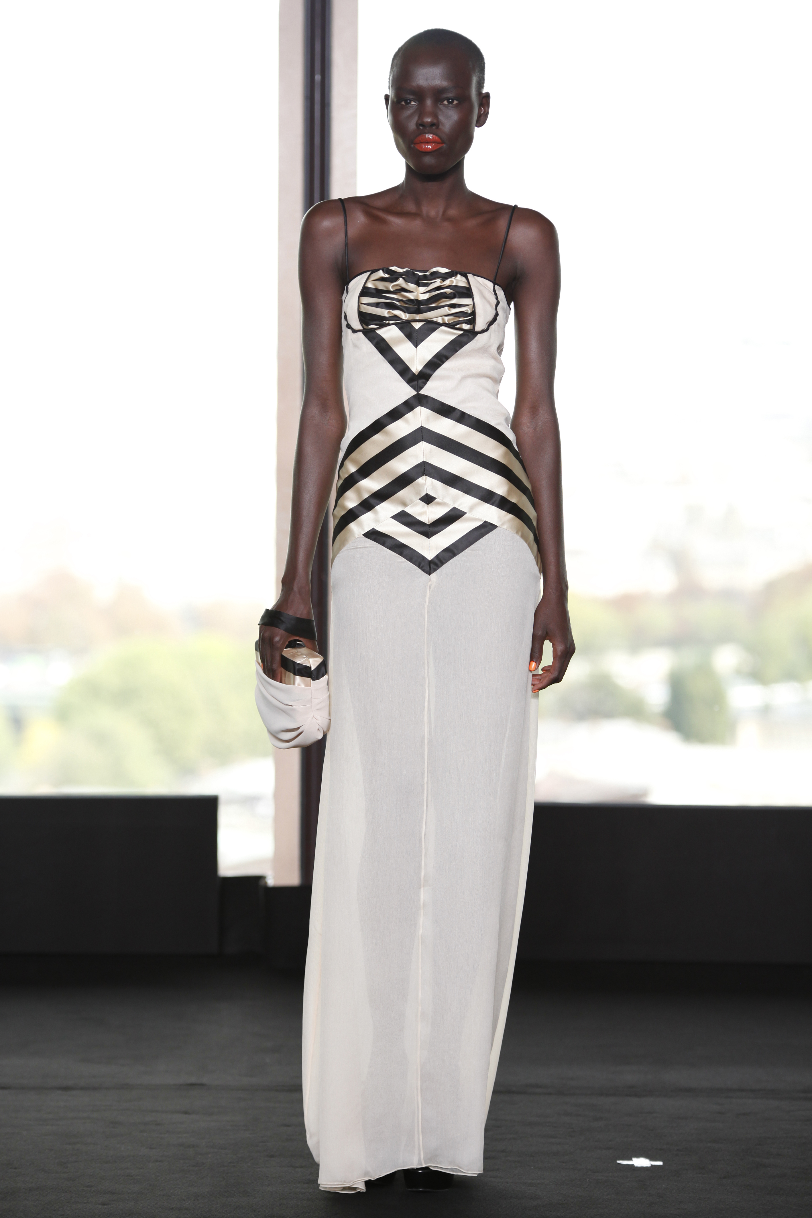 Le contraste s’accentue. Des motifs géométriques rappelant l’Art Déco ponctuent de longues robes de soirées. Les épaules sont mises en valeur grâce à d’audacieux artifices comme ce collier entourant le cou et retombant sur le devant de la robe. L’apparente fragilité du début apparaît soudain comme une force.