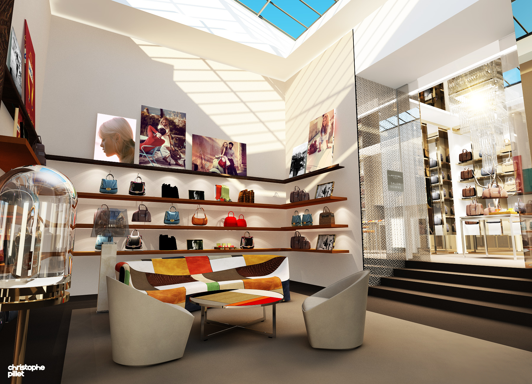 Imaginé par Christophe Pillet, architecte et designer emblématique de la génération « French Touch » diplômé des Arts Décoratifs et de la Domus Academy de Milan, qui collabora avec de grands noms du design tels que Philippe Starck ou Martine Bedin, ce nouvel écrin a été conçu à la manière d’une galerie de sacs.