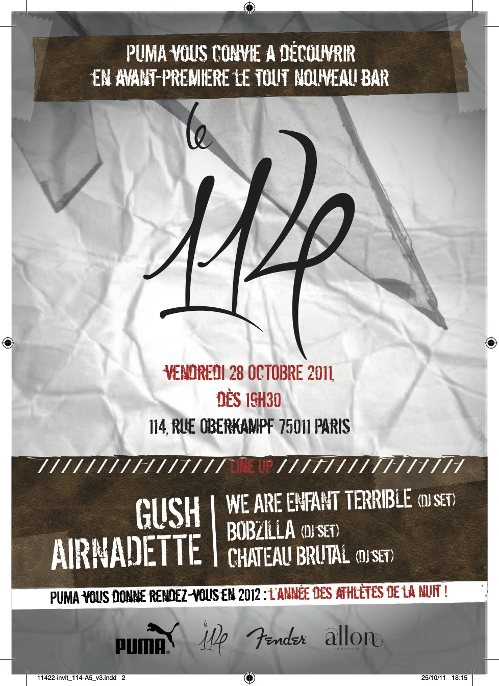 Grâce au soutien de PUMA, qui vous réserve des surprises, FENDER, ALLON Communication, des AIRNADETTE, et de son nouveau D.A, Mr Gunther Love, “Le 114” se prépare pour de merveilleuses aventures… bien rock, bien cool, bien déjantées !