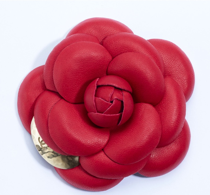 En exclusivité pour le magasin, Karl Lagerfeld a recréé l’emblématique camélia en une création de cuir rouge, orné d’un seul et unique pétale en métal.