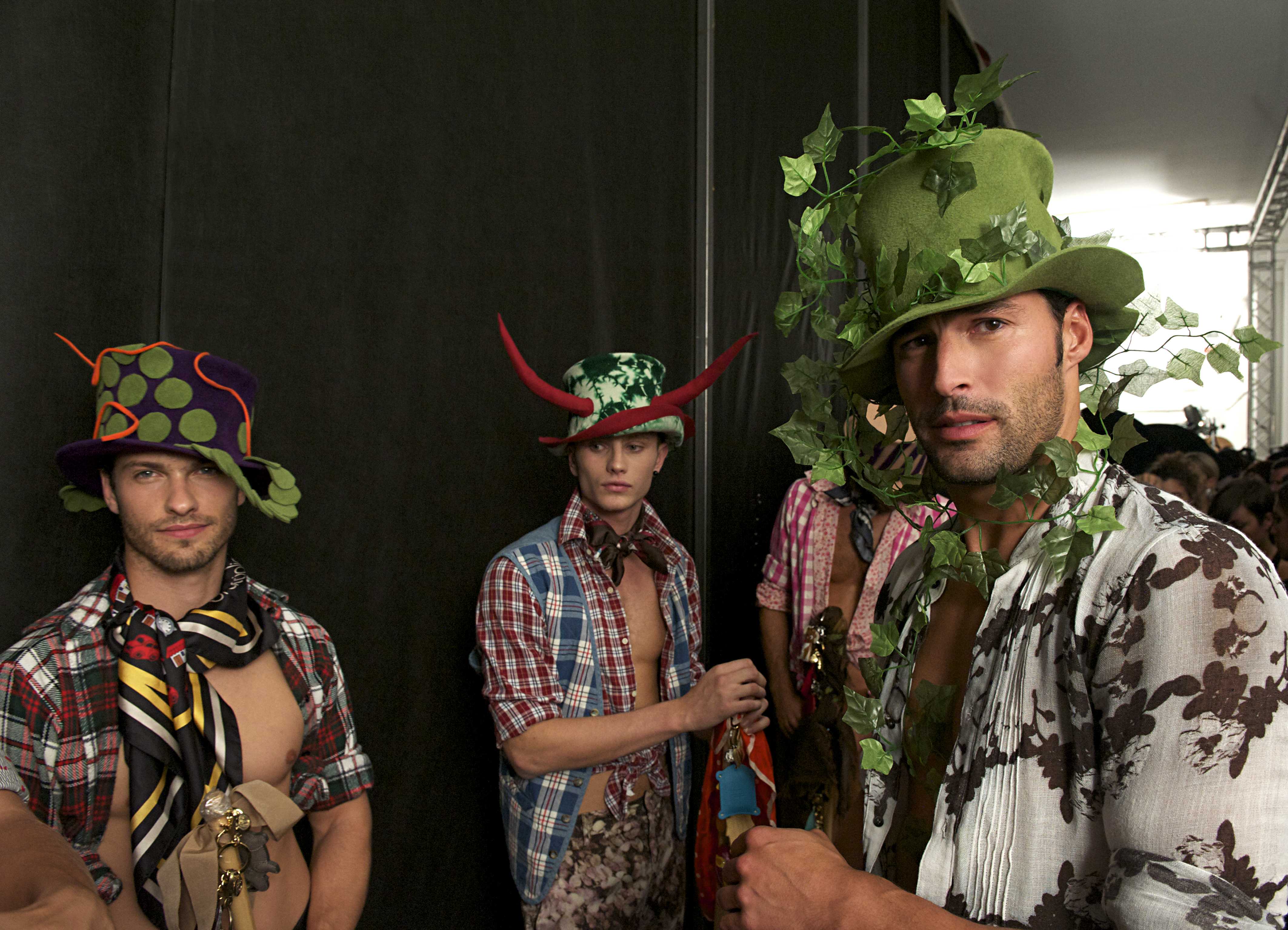 Premier défilé de la Fashion Week de Milan Le défilé de la Marque de sacs Italienne Braccialini était un spectacle pour lequel Elvis POMPILIO qui présentait une collection de chapeaux avait reçu Carte Blanche.