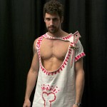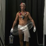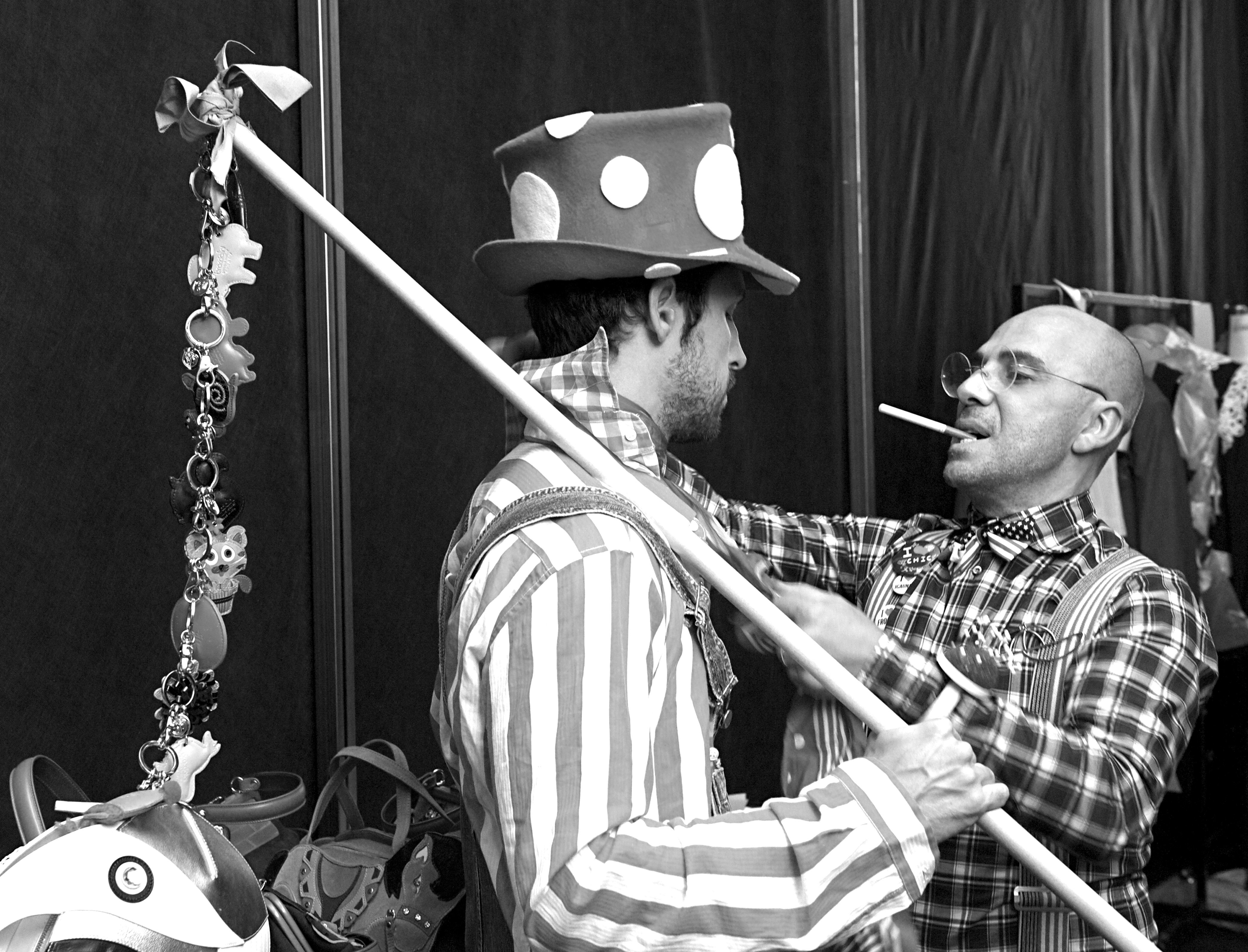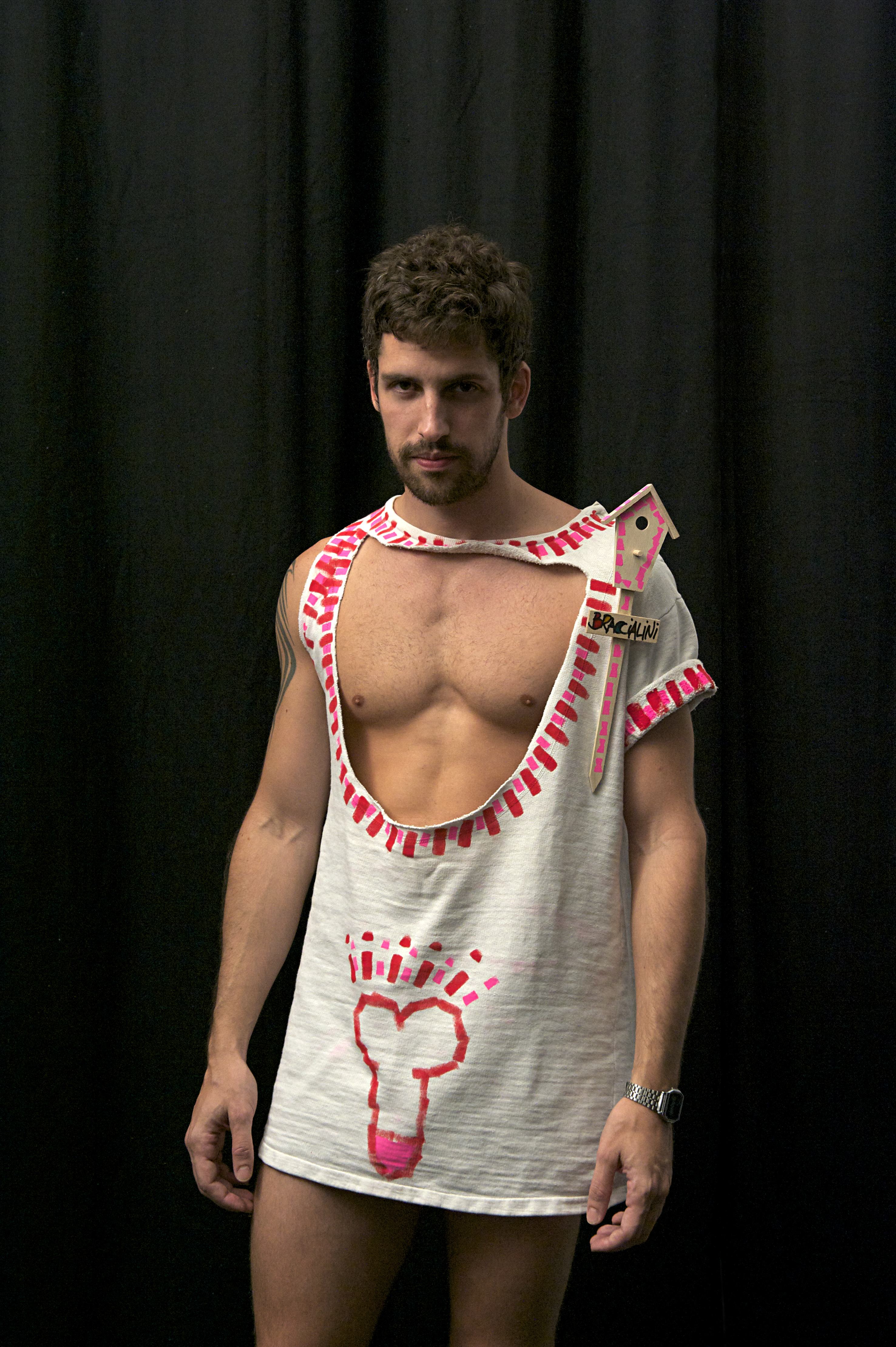 Elvis Pompilio avait, pour l’occasion, créé également une collection de vêtements à base de matières parfois prestigieuses et parfois décalées comme du papier bulle pour des mariées aux allures très cinquante, des photographies géantes de la famille Braccialini pour un passage haut en couleurs ou des franges noires et brillantes pour des belles des années trente.