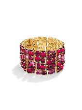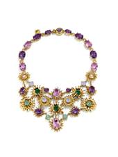 La collection qui résulte de ce travail comprend comprend plus de 20 pièces dans un large éventail de cristaux : des pierres semi‐précieuses (améthyste, cristal de roche, malachite et quartz rose), des cristaux Swarovski, du verre coupé à la main et des métaux plaqués or. Le fil conducteur des créations reste bien évidemment l’élégance et le luxe, définition même de la maison. Parmi les modèles présentés, on trouvera le multicolore plastron Duchess, inspiré par le collier dessiné par Tony Duquette pour la Duchesse de Windsor, des manchettes en émail, des dormeuses délicates, des pochettes ornées de pierreries et d’une écharpe en soie.