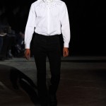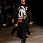 Des superpositions architecturées en trompe l’œil renouvellent les cabans en drap de laine ou en drap de laine et cuir. La toile denim est soumise à moult délavages, du bleu le plus pâle à l’indigo profond. Les blousons zippés à applications de gros-grain de coton rouge jouent sur toutes ces tonalités de bleu. Le savoir-faire artisanal se retrouve dans un gilet en poney rebrodé de pastilles de poney porté sur un blouson en cuir mi-bomber/mi-perfecto. Les imprimés parsèment la collection entre fondu de visage d’homme et tête de minotaure et les multiples réinterprétations de la bannière étoilée.