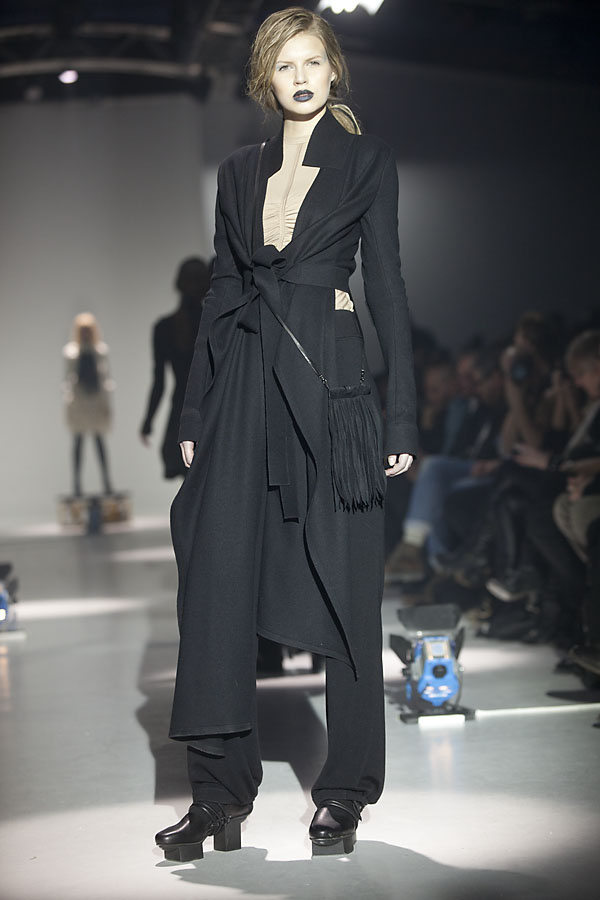 Son hiver se concentre sur le haut de la silhouette – les cols farouches, les pseudos-capes, les foulards déclinés en colliers et les écharpes fantasques -, enveloppé dans des volumes distants du corps qui ne l’effacent pas pour autant. Passent également des pièces aussi évidentes que renversantes, comme ces trompes l’oeil & dye ou cet admirable trois-quarts en soie toutes coutures rabattues.