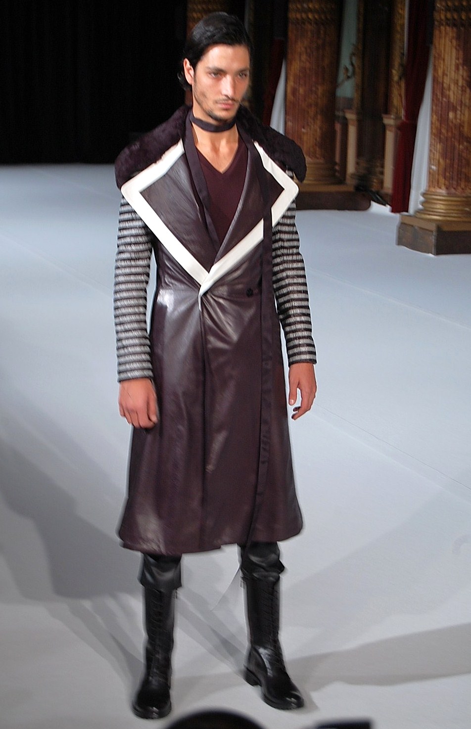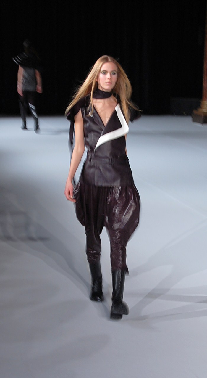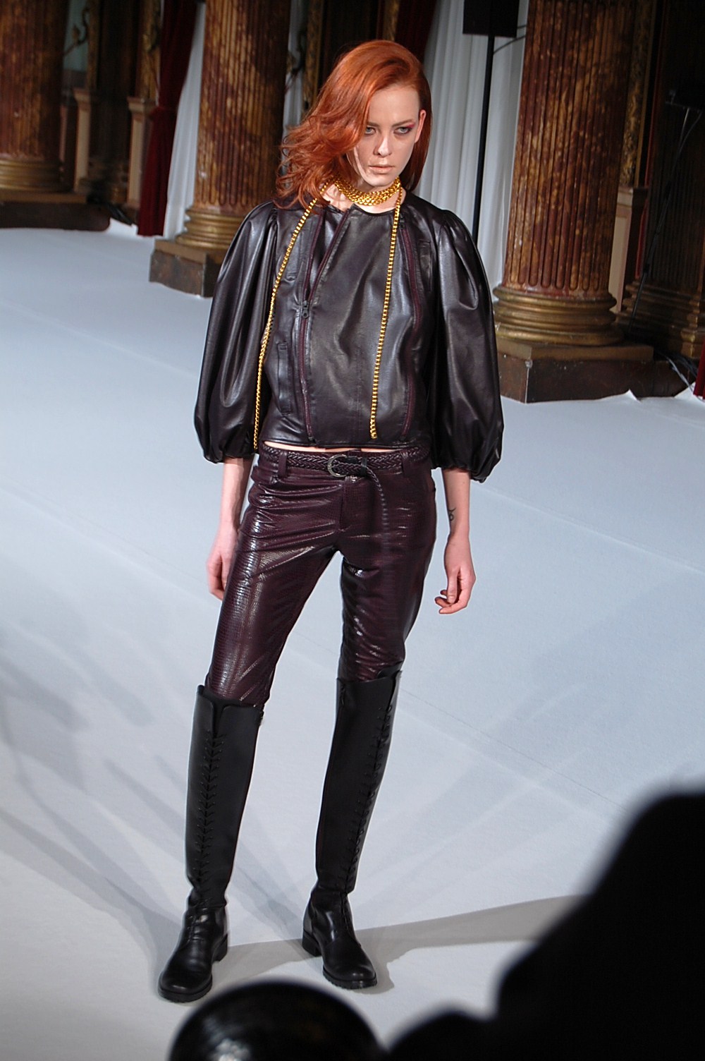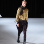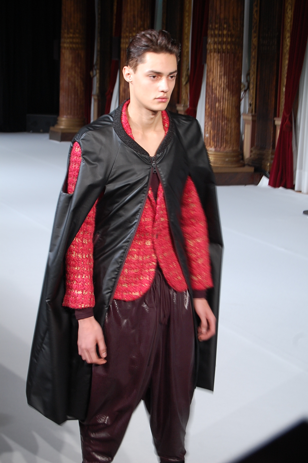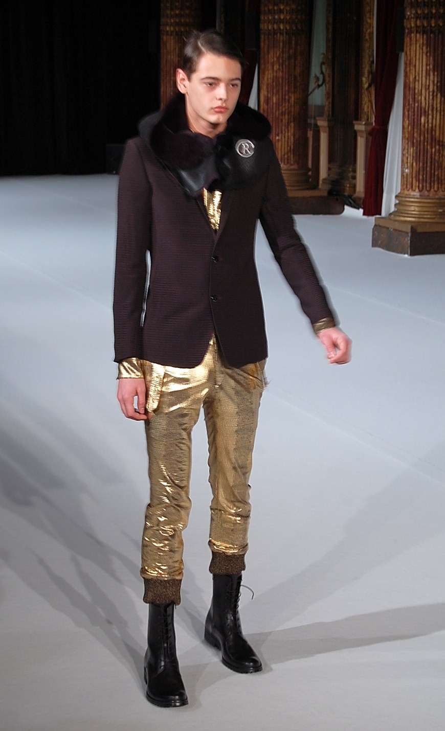 Pour cette collection, Rynshu a crée deux tissus originaux : un en tweed de lamé noir et gros fil blanc et un en tweed jacquard de lamé or et gros fil rouge ; il les a associé à d’autres matières telles que le cachemire, le cuir d’agneau espagnol , un cuir/daim d’agneau avec un touché très particulier, un daim enduit, le polyester-velours, le mouton retourné, l’astrakan et le vison.