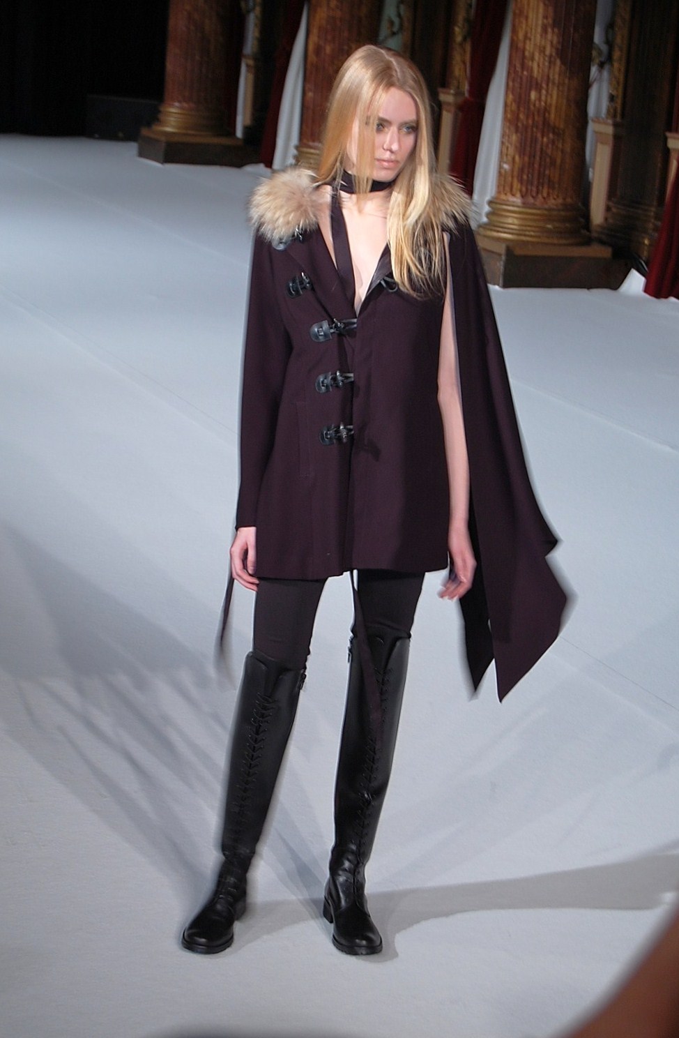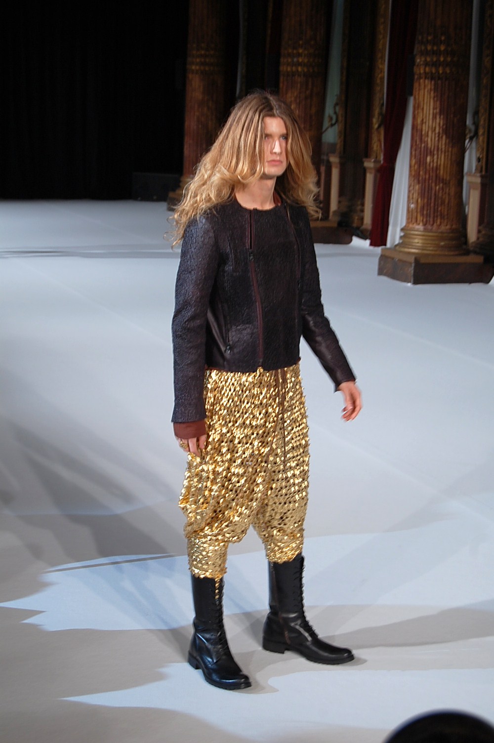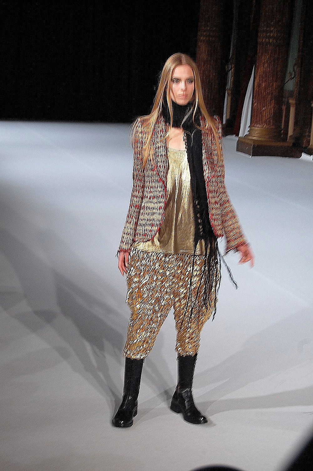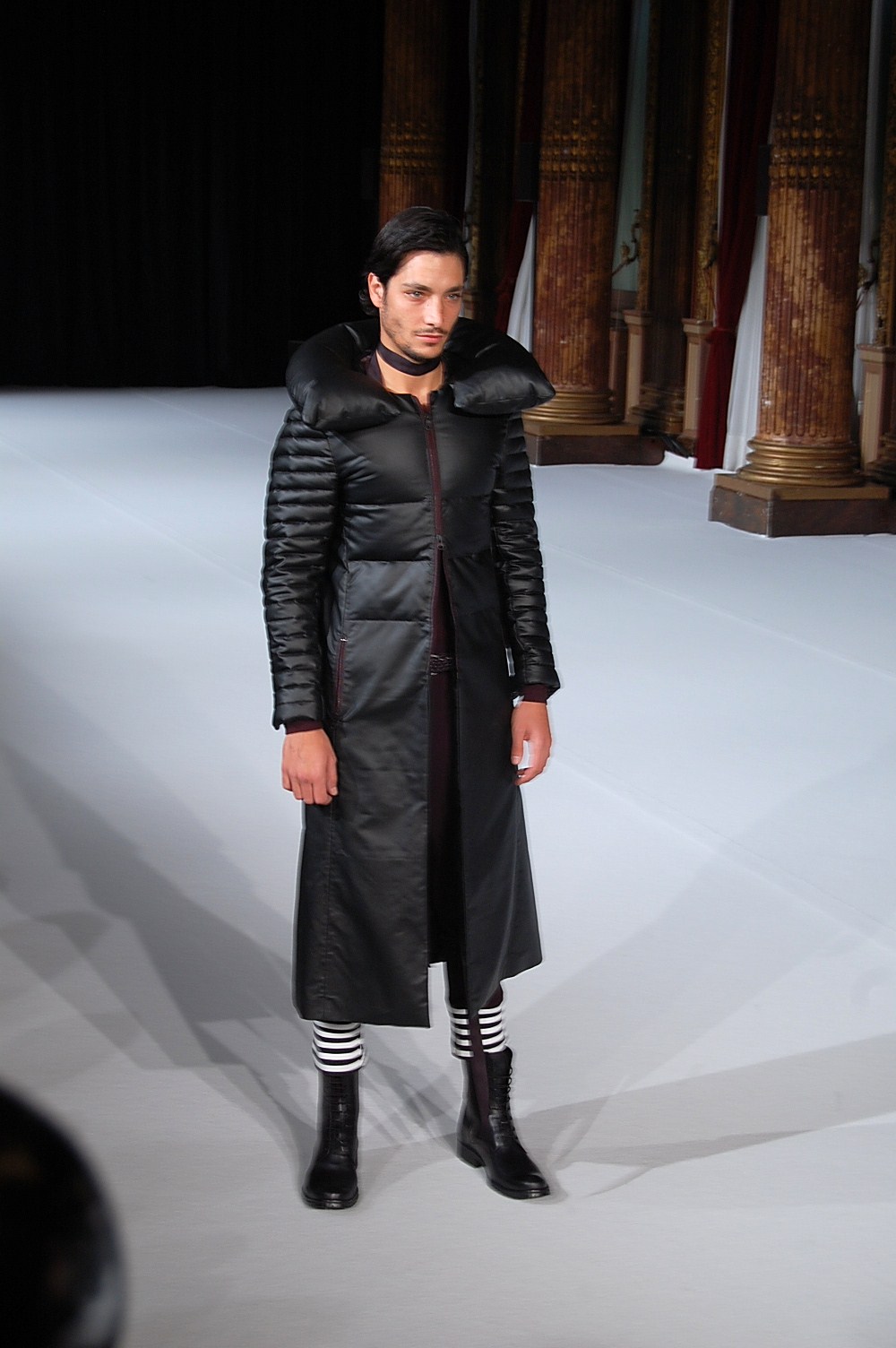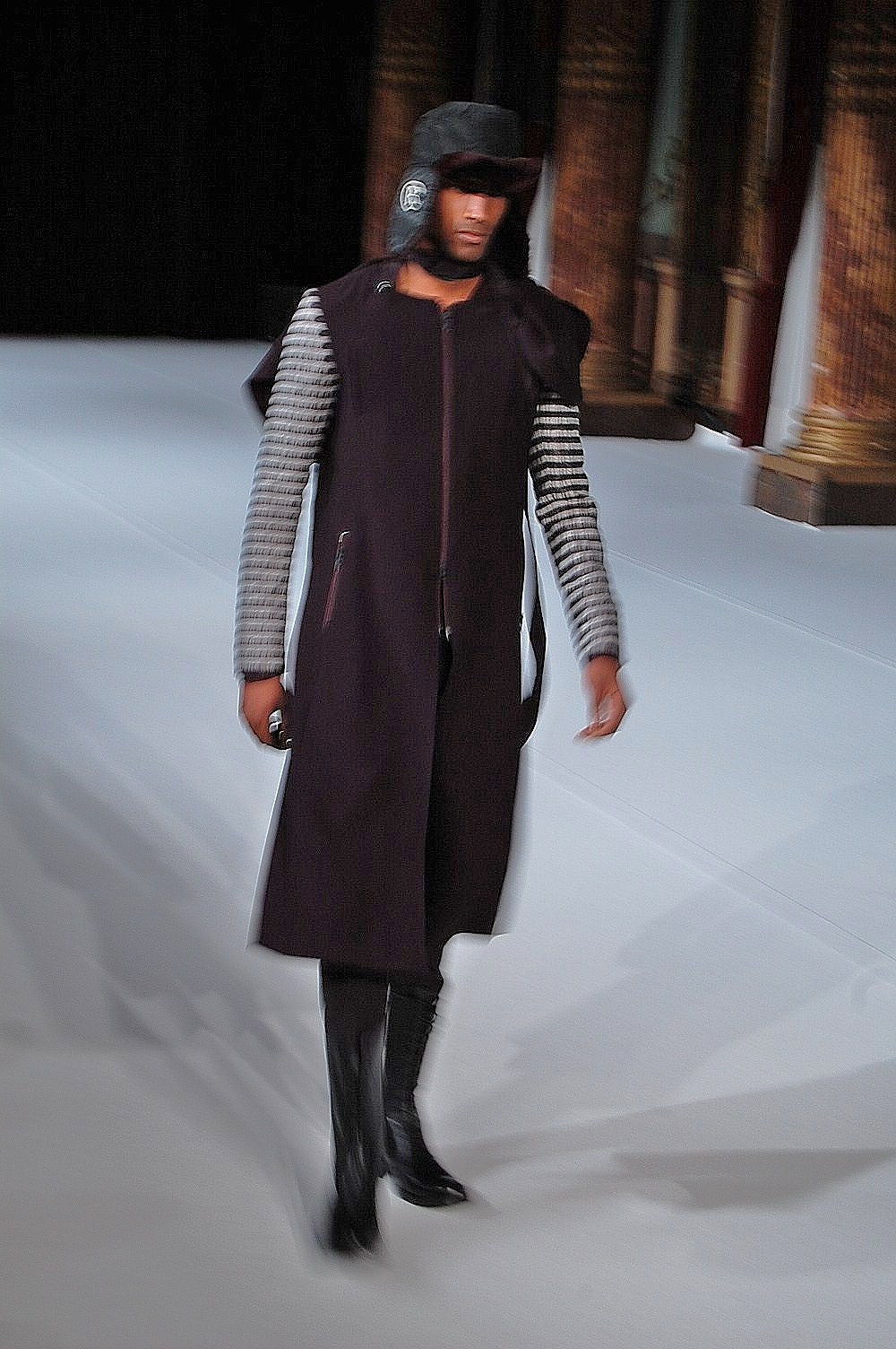 Pour cette collection, Rynshu a crée deux tissus originaux : un en tweed de lamé noir et gros fil blanc et un en tweed jacquard de lamé or et gros fil rouge ; il les a associé à d’autres matières telles que le cachemire, le cuir d’agneau espagnol , un cuir/daim d’agneau avec un touché très particulier, un daim enduit, le polyester-velours, le mouton retourné, l’astrakan et le vison.
