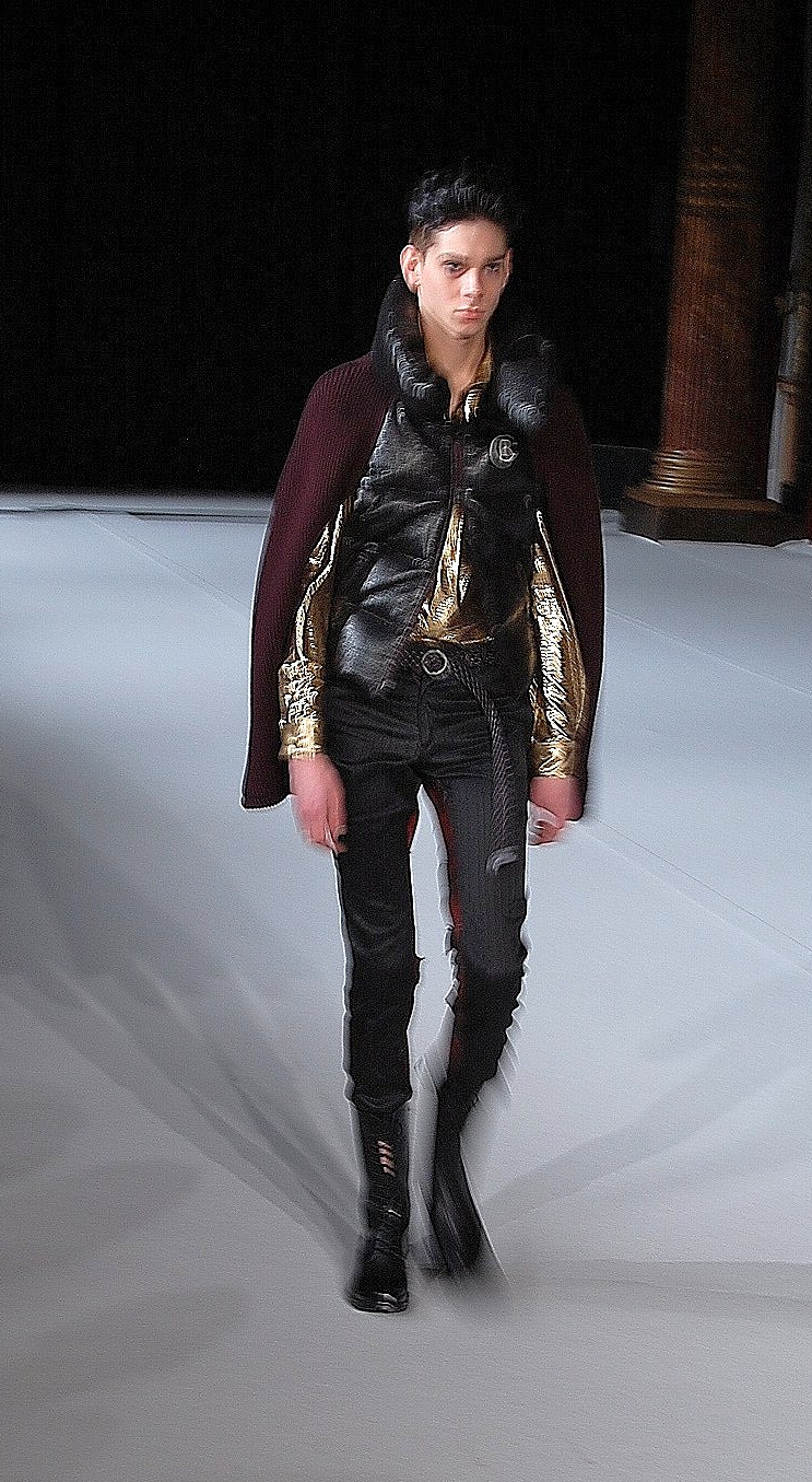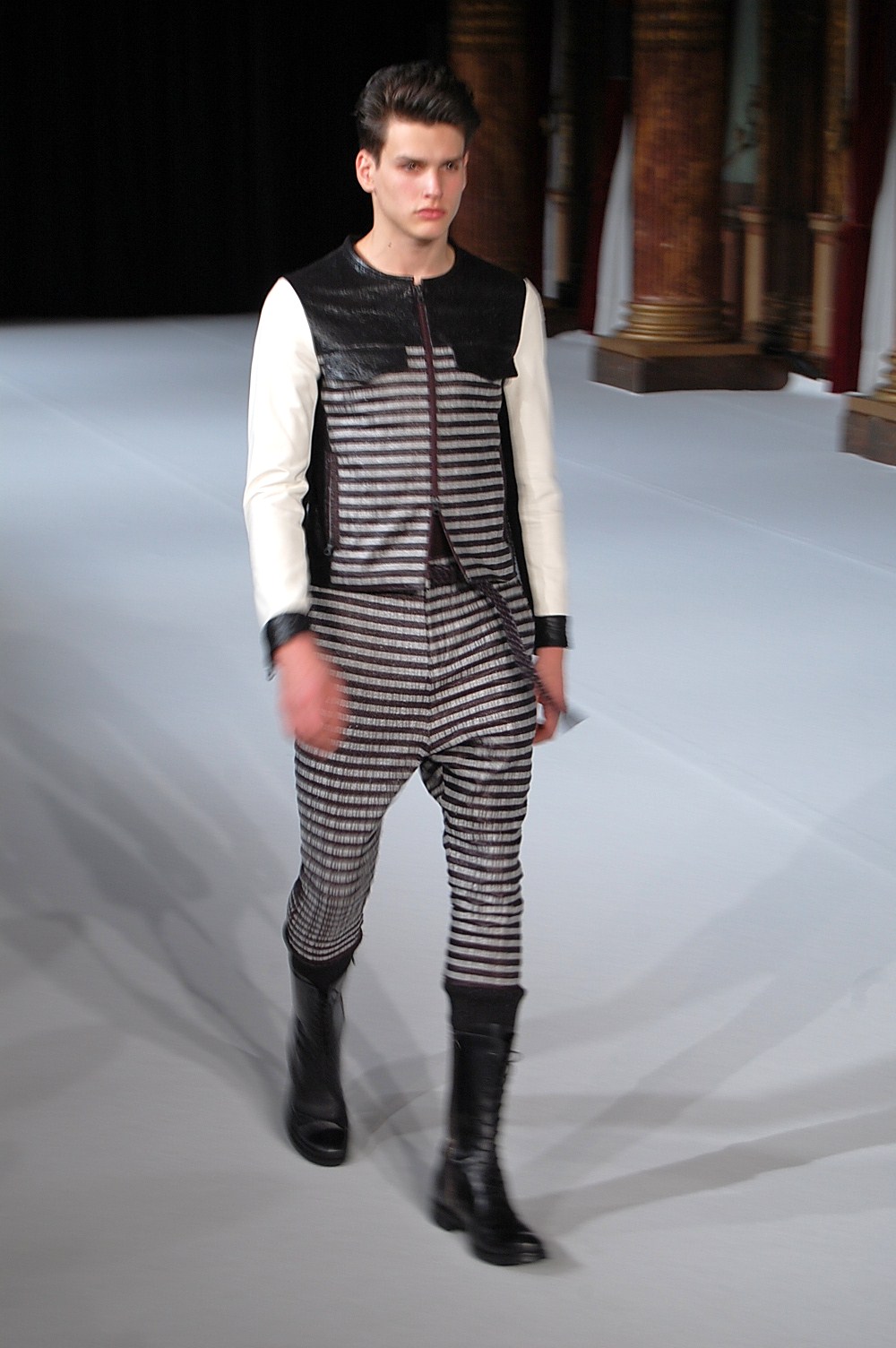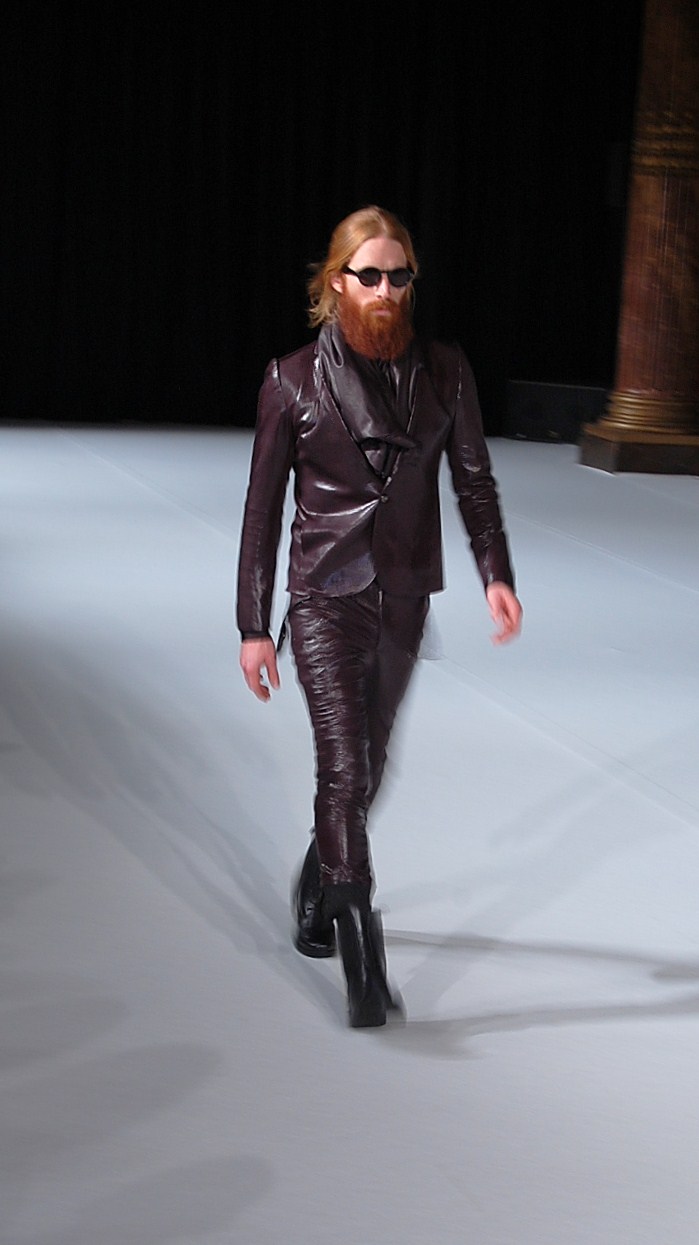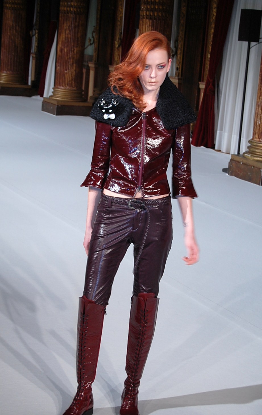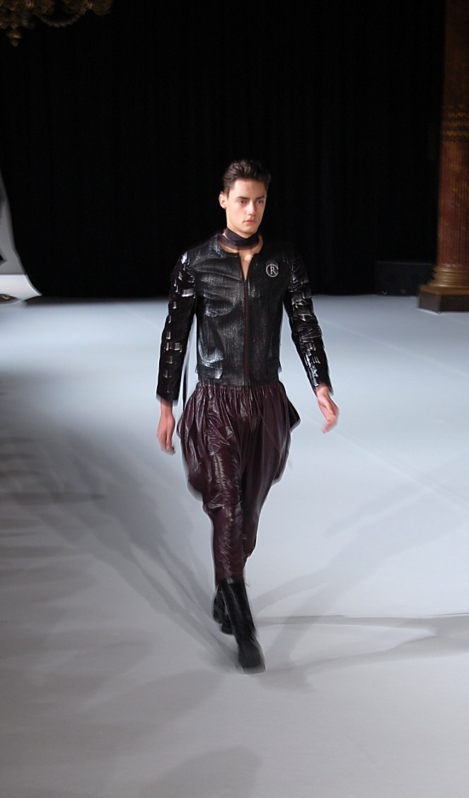 Pour cette collection, Rynshu a crée deux tissus originaux : un en tweed de lamé noir et gros fil blanc et un en tweed jacquard de lamé or et gros fil rouge ; il les a associé à d’autres matières telles que le cachemire, le cuir d’agneau espagnol , un cuir/daim d’agneau avec un touché très particulier, un daim enduit, le polyester-velours, le mouton retourné, l’astrakan et le vison.