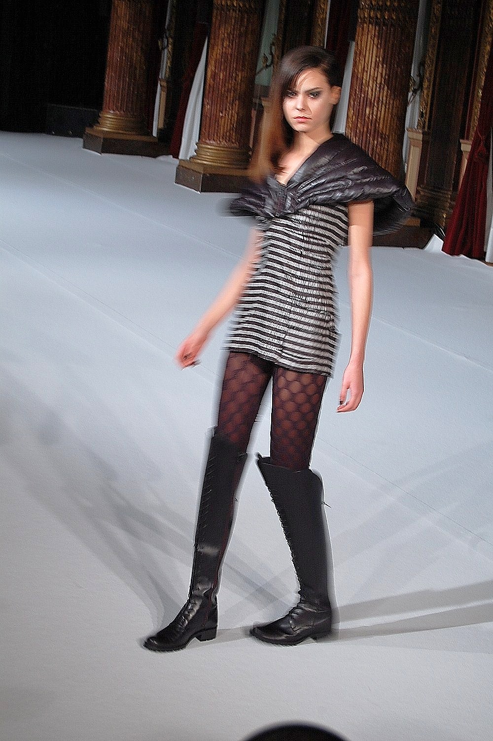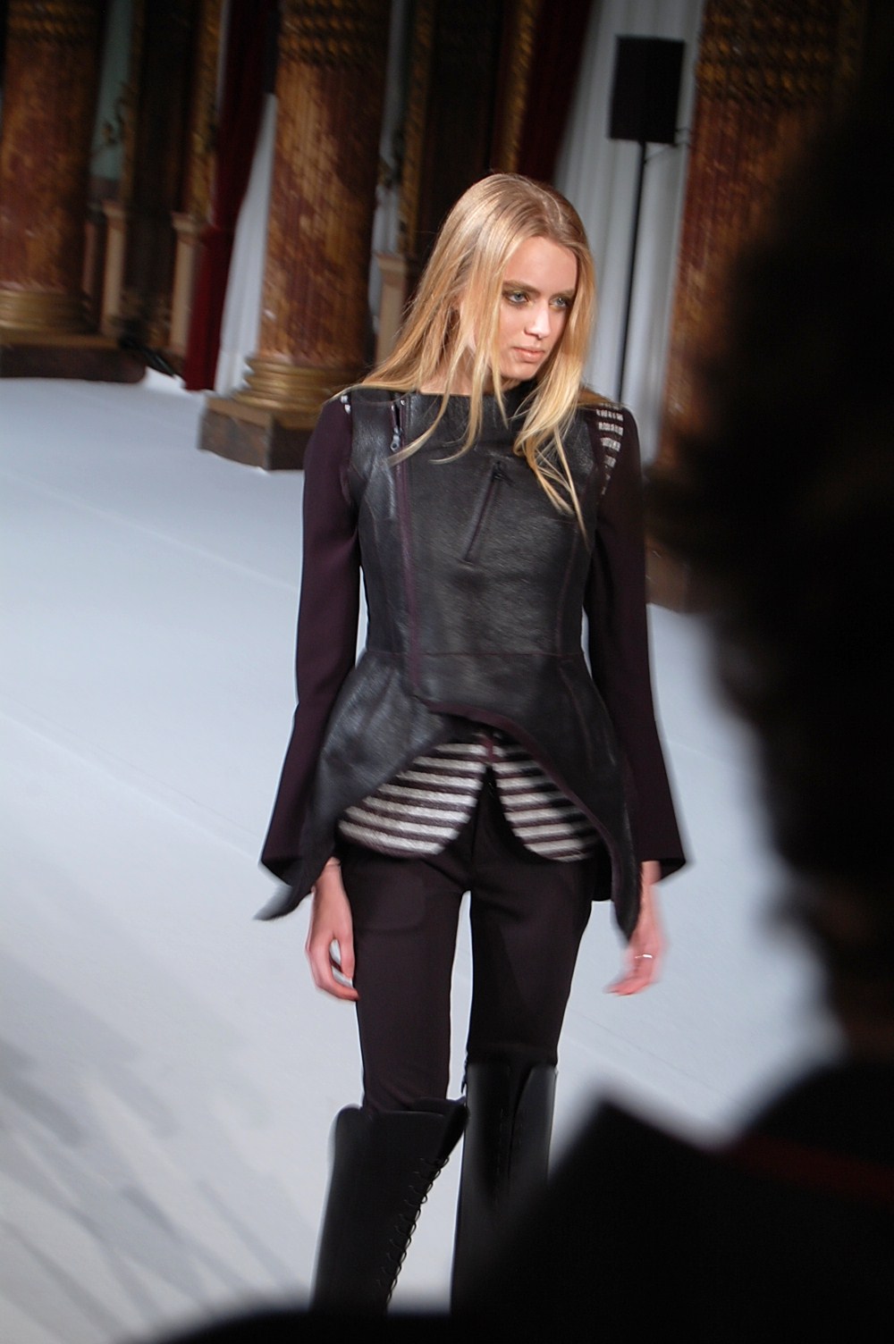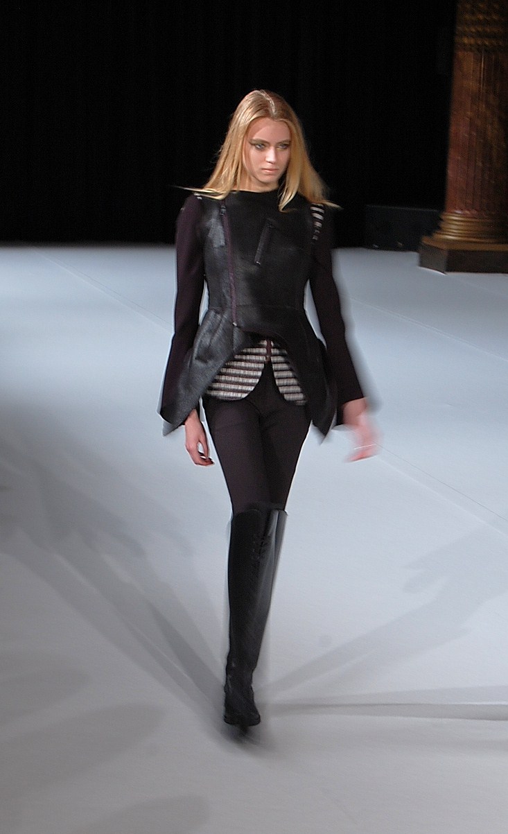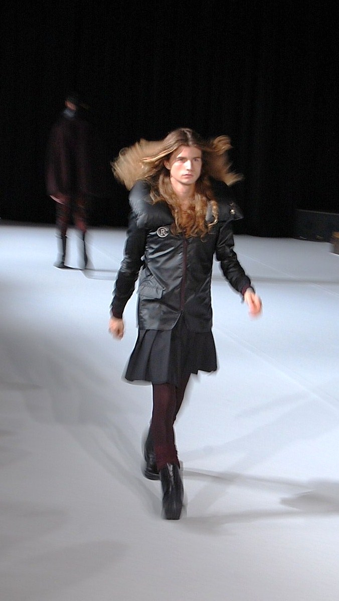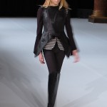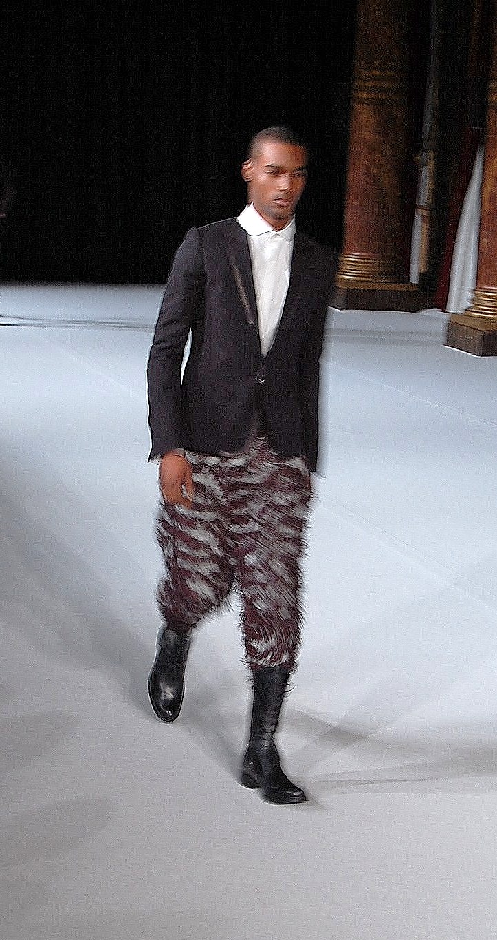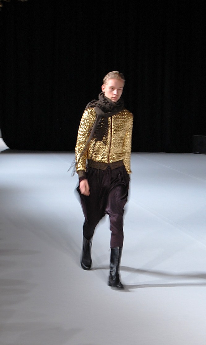 Pour cette collection, Rynshu a crée deux tissus originaux : un en tweed de lamé noir et gros fil blanc et un en tweed jacquard de lamé or et gros fil rouge ; il les a associé à d’autres matières telles que le cachemire, le cuir d’agneau espagnol , un cuir/daim d’agneau avec un touché très particulier, un daim enduit, le polyester-velours, le mouton retourné, l’astrakan et le vison.