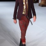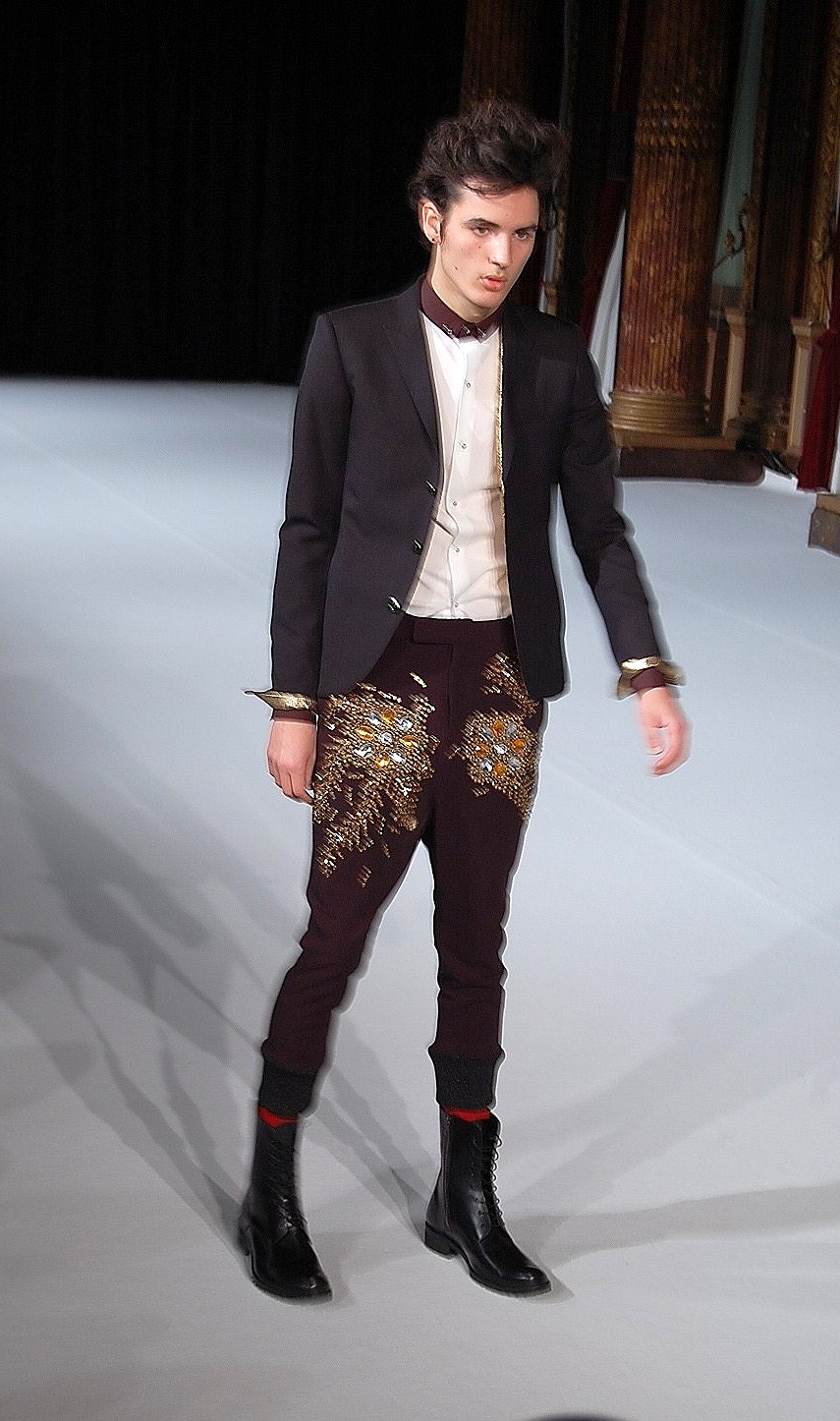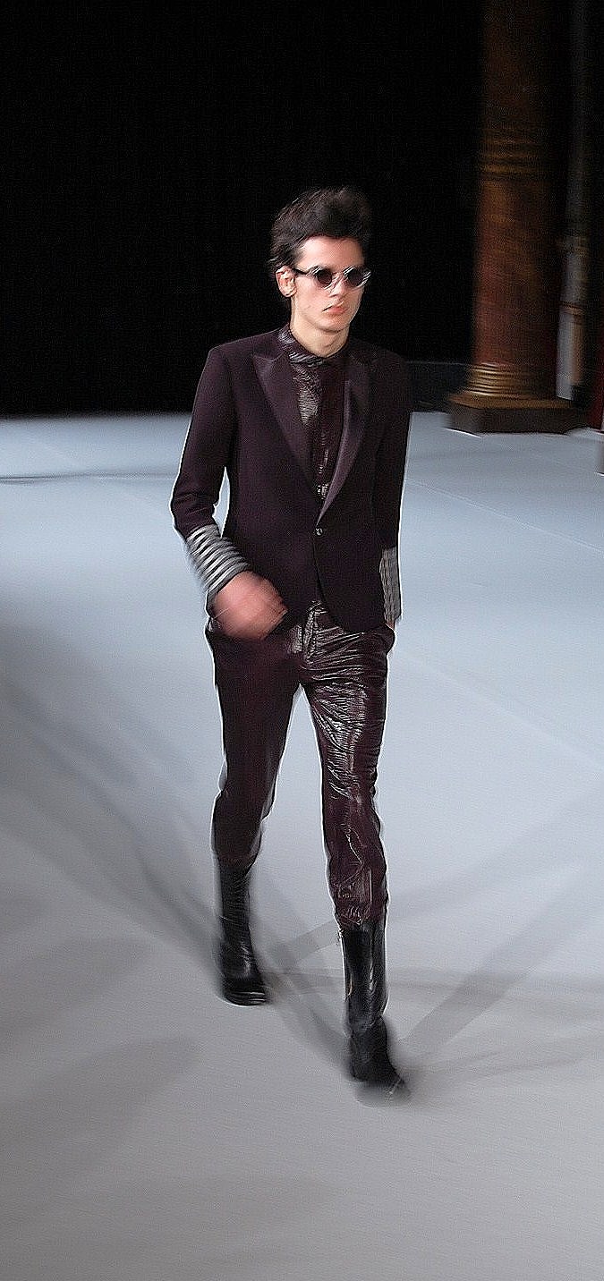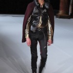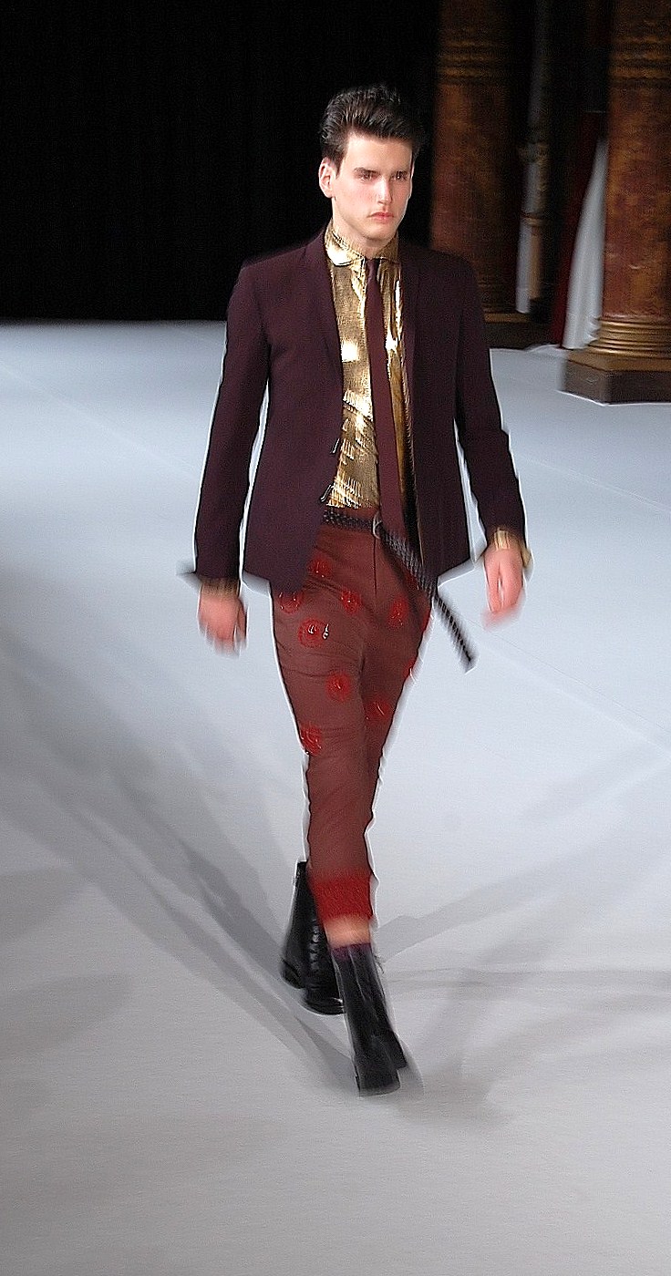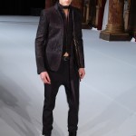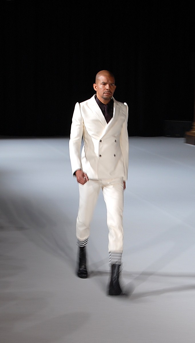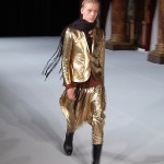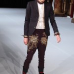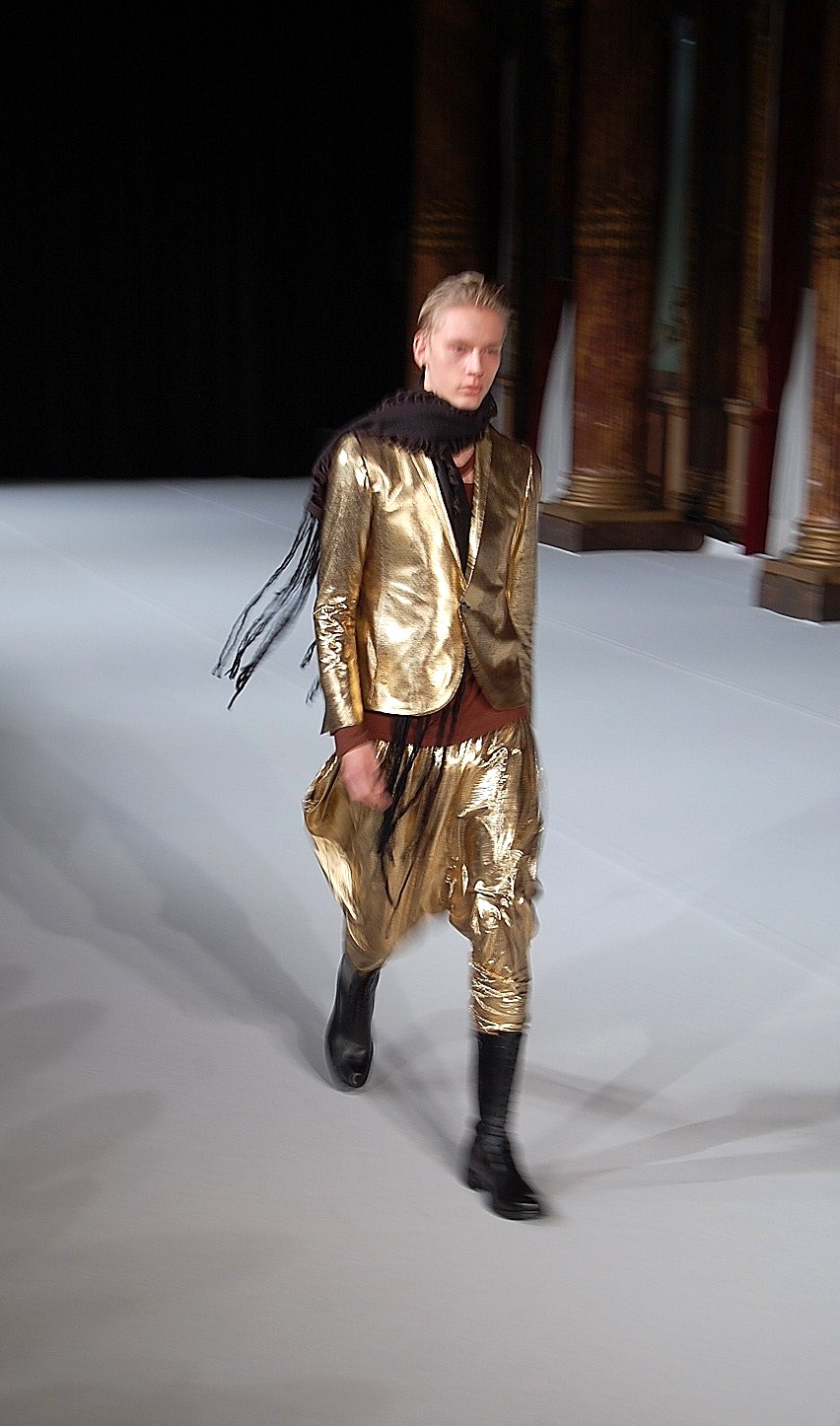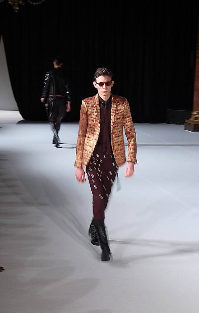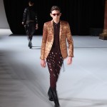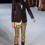 Le créateur a d’ailleurs utilisé le lamé or (perforé ou motif « crocodile ») par touches sur les bords du devant de la veste et au niveau des poignets