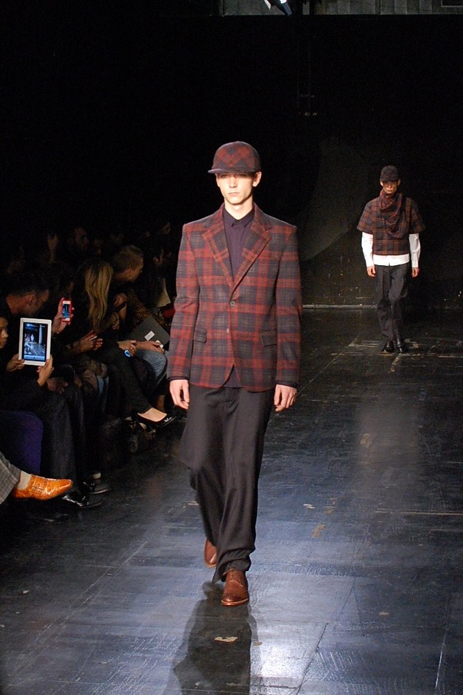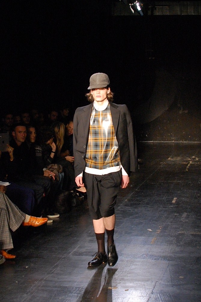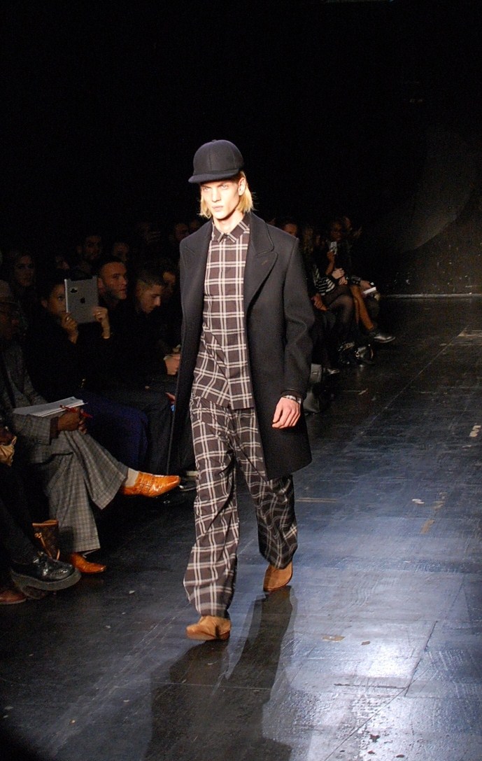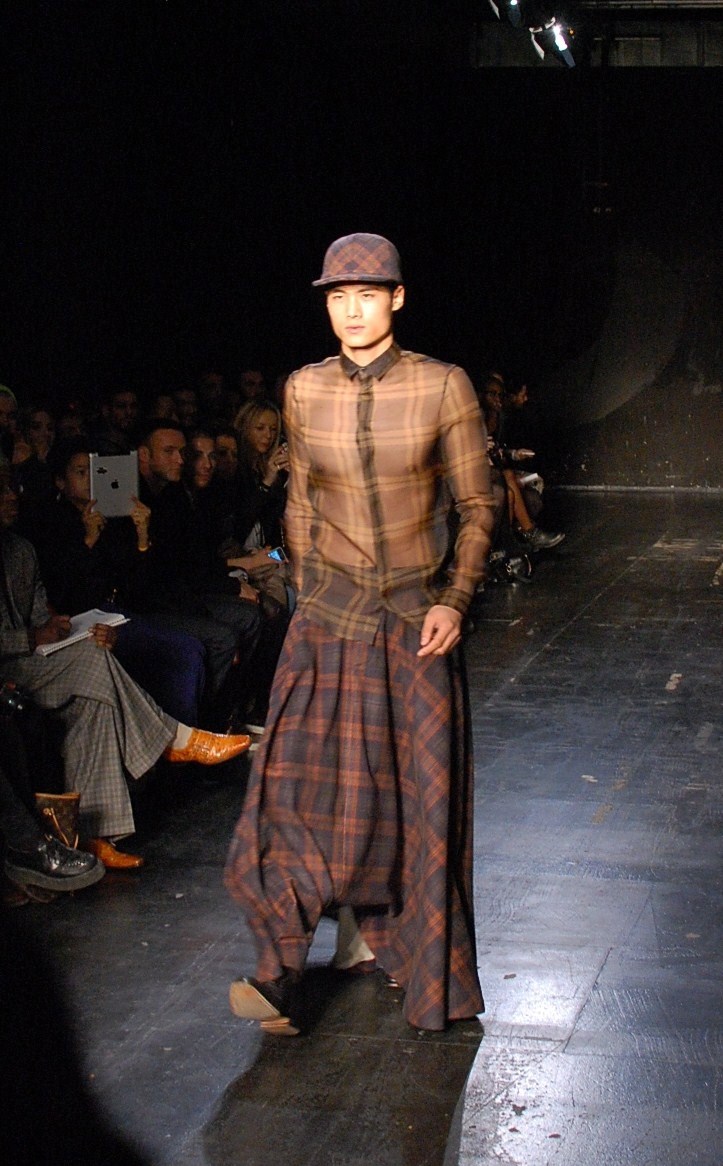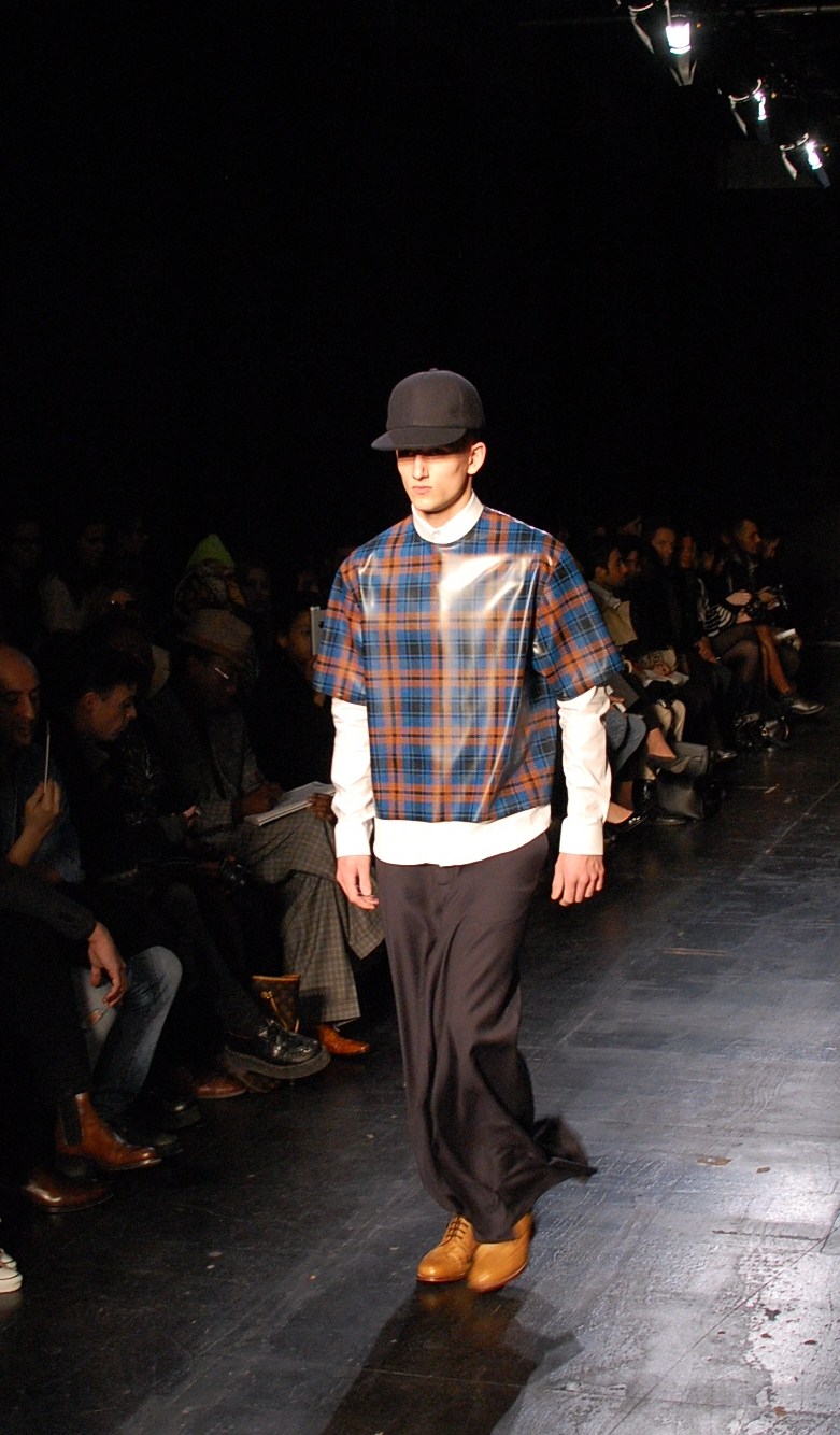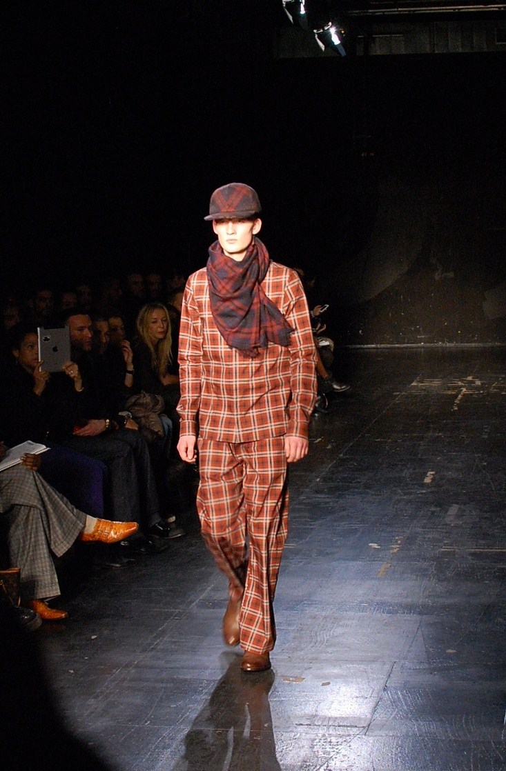 Les hauts à manches longues en latex et en cuir noir maquent à peine des chemises blanches de costume. Les motifs écossais sont présents sur la casi totalité des pièces, moulés dans le cuir ou imprimés sur les pantalons à pince. Deux gammes se distinguent, une plus sombre où le noir domine et une plus chaleureuse rouge-orangée. Les chemises sont de légers voiles transparents et fluides sur lesquels nous retrouvons encore des carreaux écossais. Côté accessoires on remarque les casquettes à large visière et les foulards à peine drapés autour du cou.