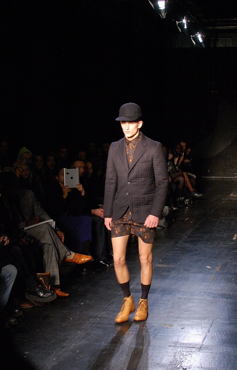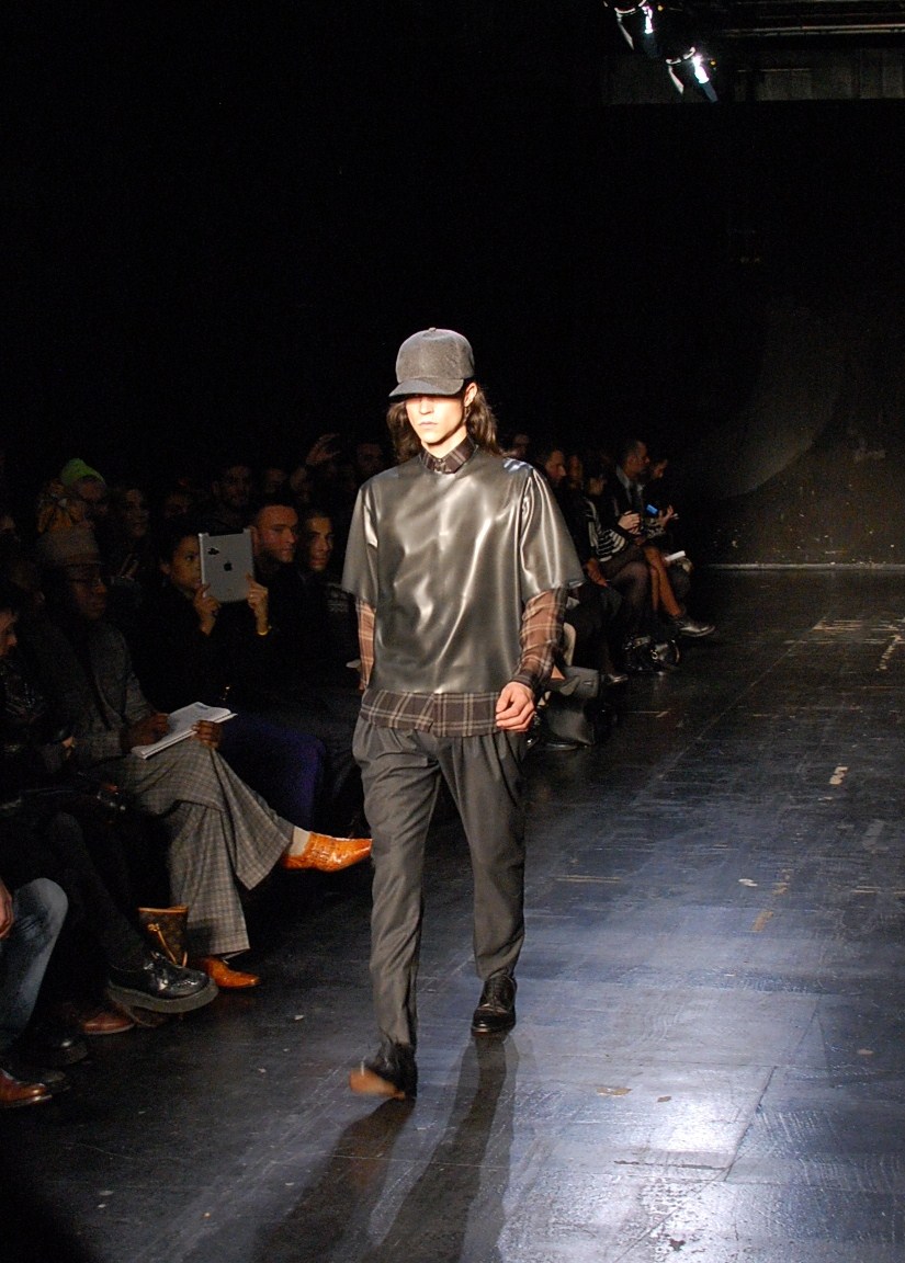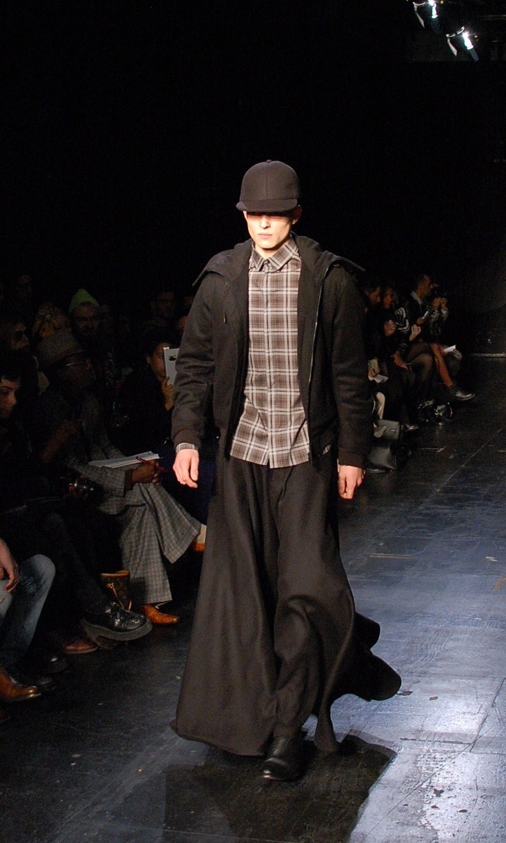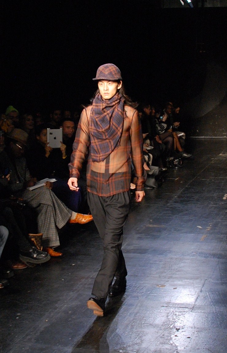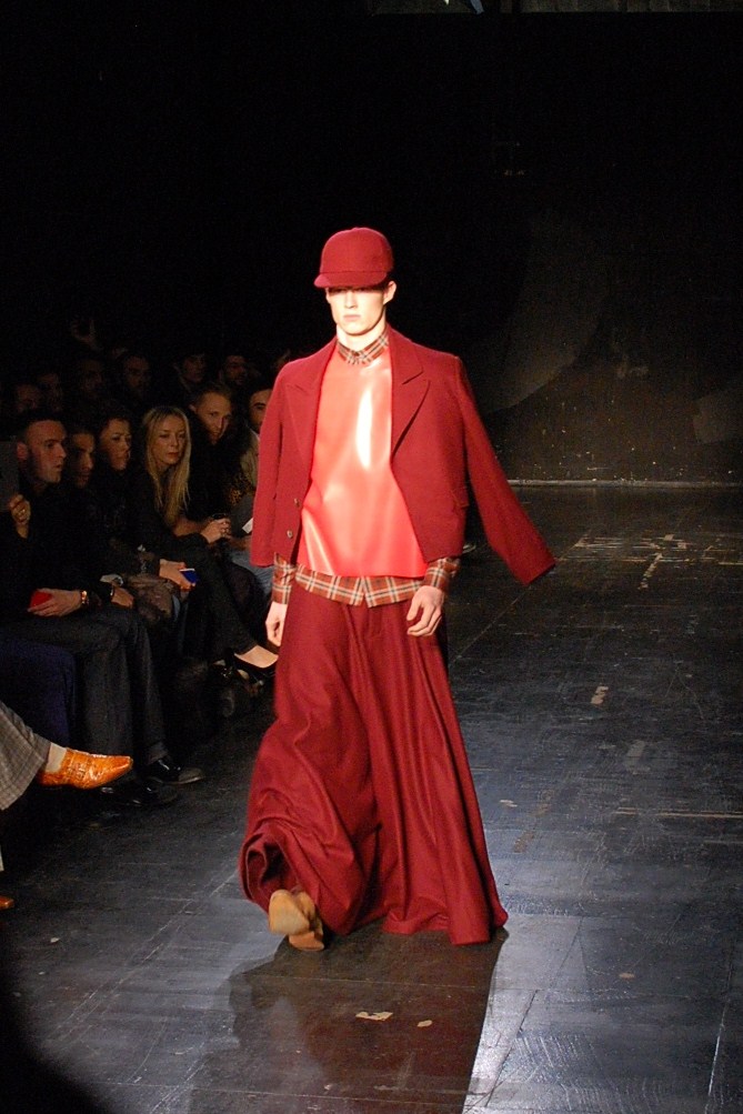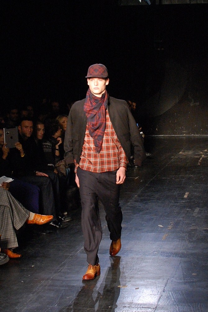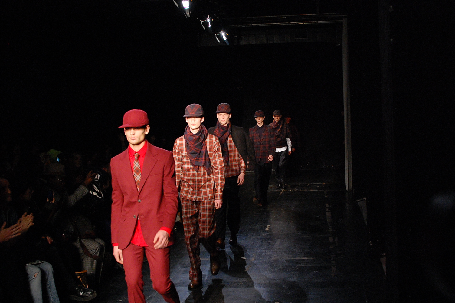 Les hauts à manches longues en latex et en cuir noir maquent à peine des chemises blanches de costume. Les motifs écossais sont présents sur la casi totalité des pièces, moulés dans le cuir ou imprimés sur les pantalons à pince. Deux gammes se distinguent, une plus sombre où le noir domine et une plus chaleureuse rouge-orangée. Les chemises sont de légers voiles transparents et fluides sur lesquels nous retrouvons encore des carreaux écossais. Côté accessoires on remarque les casquettes à large visière et les foulards à peine drapés autour du cou.