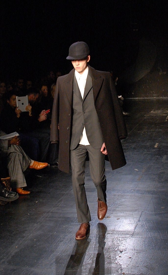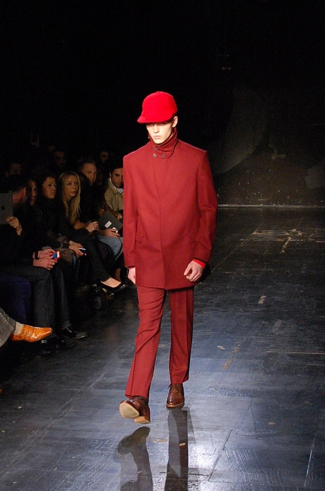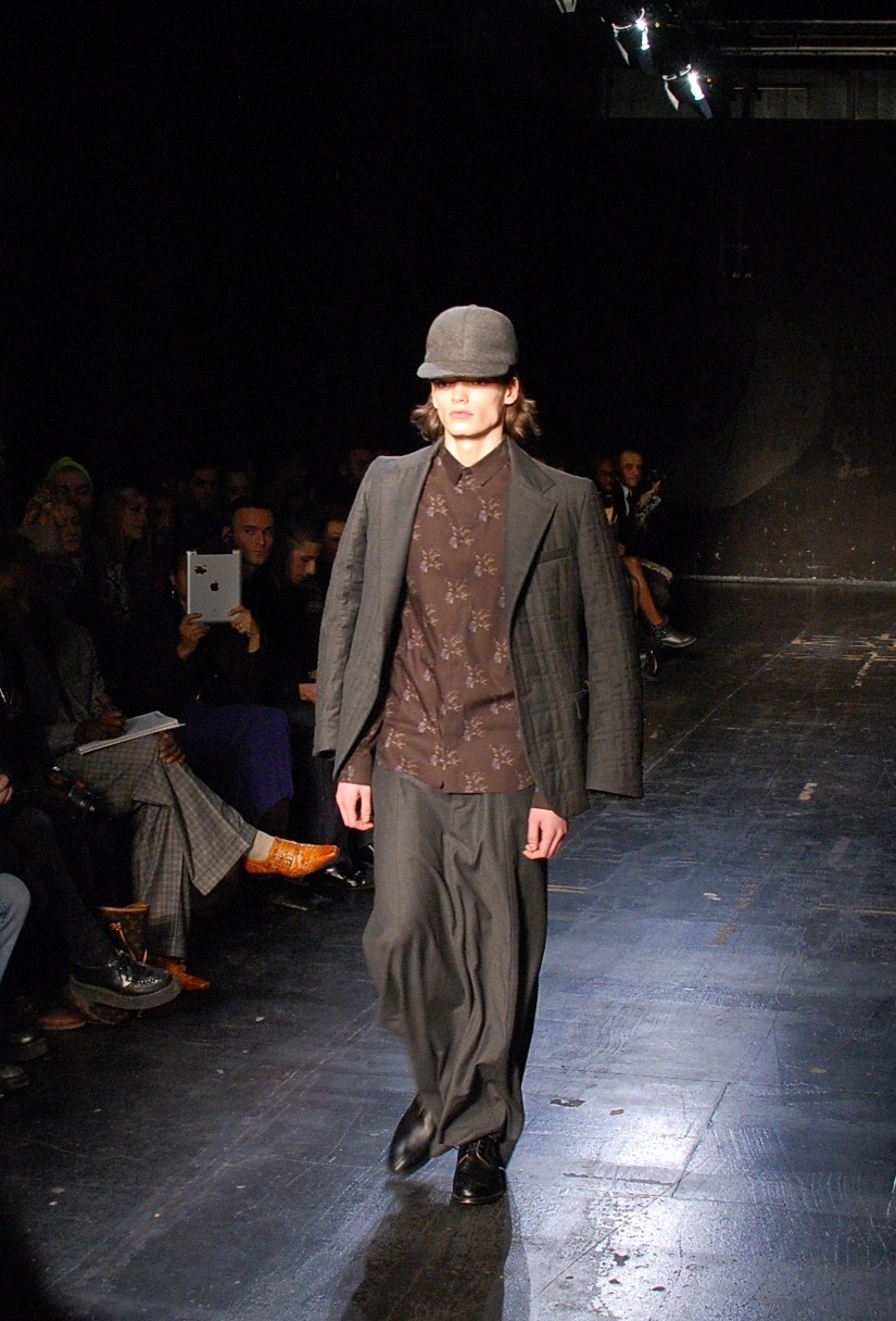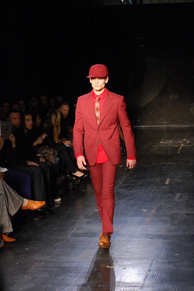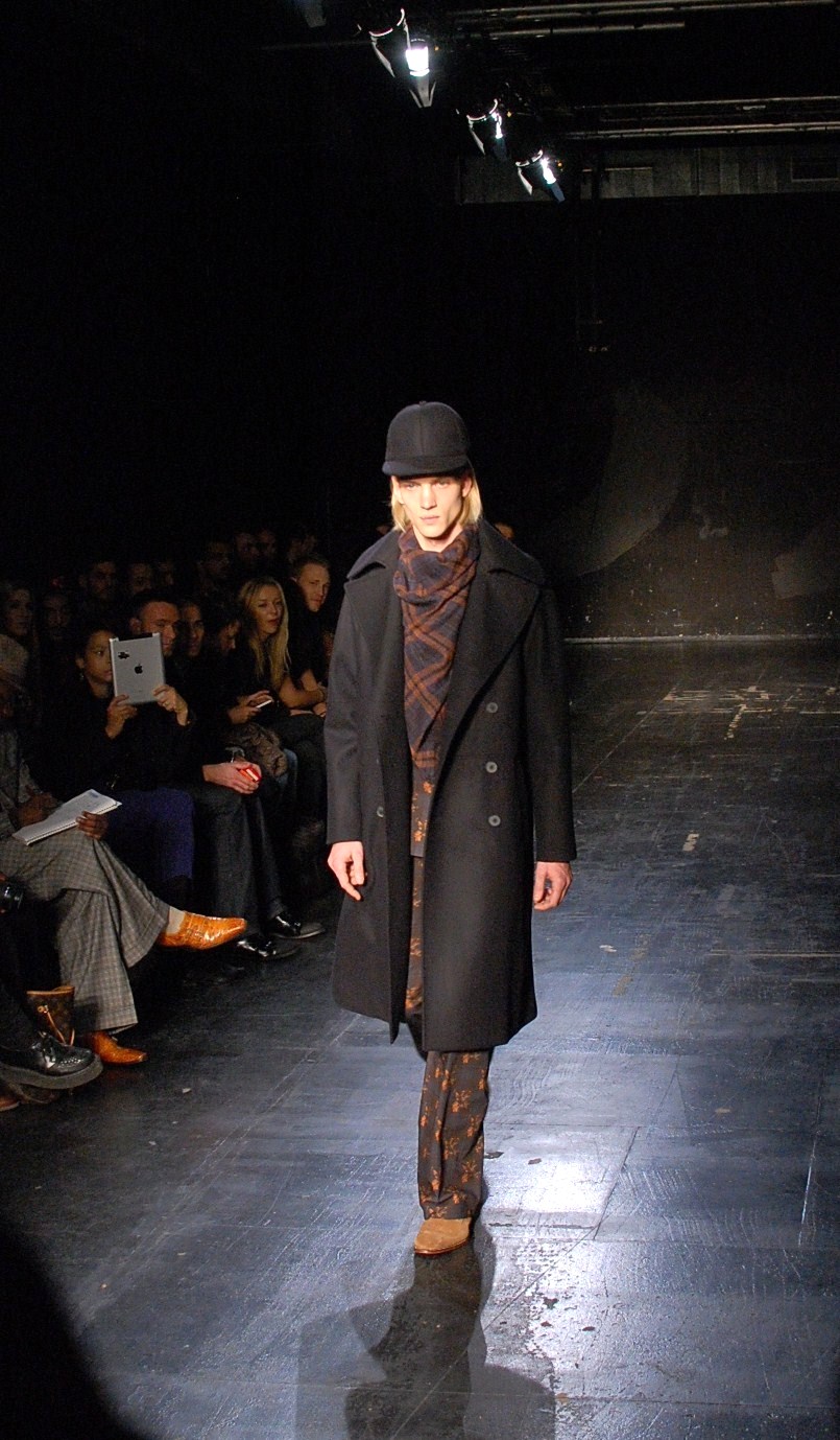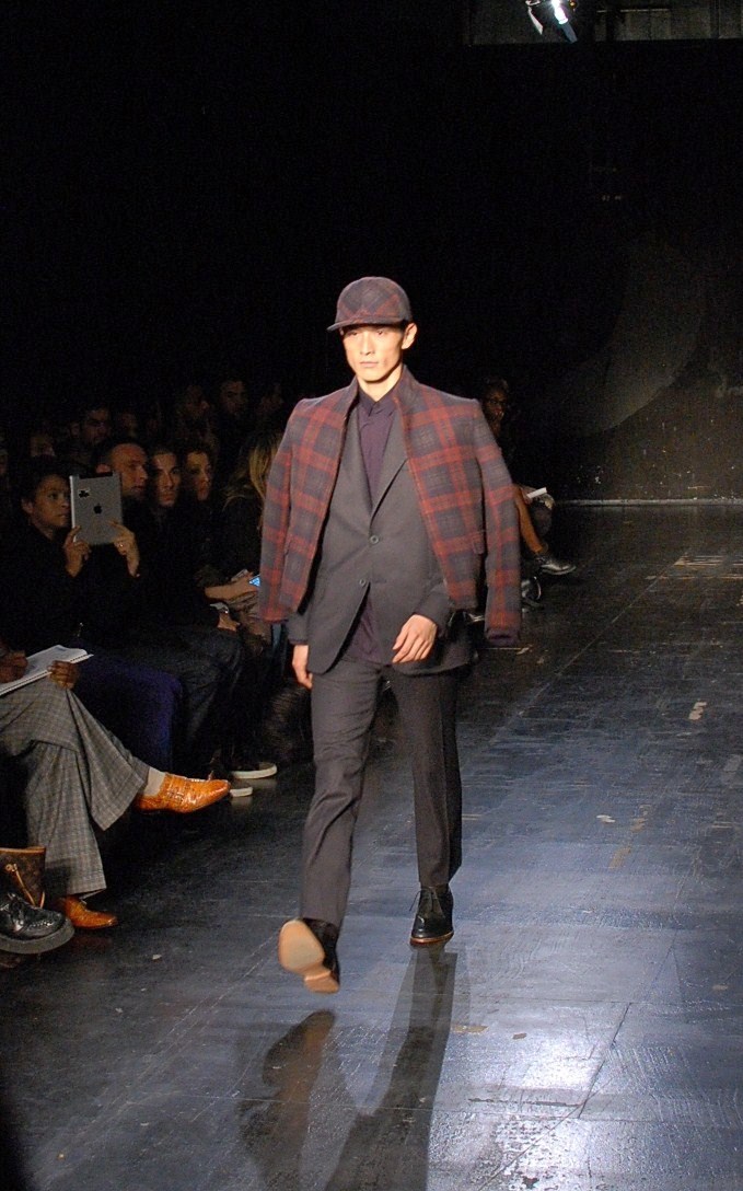 Les hauts à manches longues en latex et en cuir noir maquent à peine des chemises blanches de costume. Les motifs écossais sont présents sur la casi totalité des pièces, moulés dans le cuir ou imprimés sur les pantalons à pince. Deux gammes se distinguent, une plus sombre où le noir domine et une plus chaleureuse rouge-orangée. Les chemises sont de légers voiles transparents et fluides sur lesquels nous retrouvons encore des carreaux écossais. Côté accessoires on remarque les casquettes à large visière et les foulards à peine drapés autour du cou.