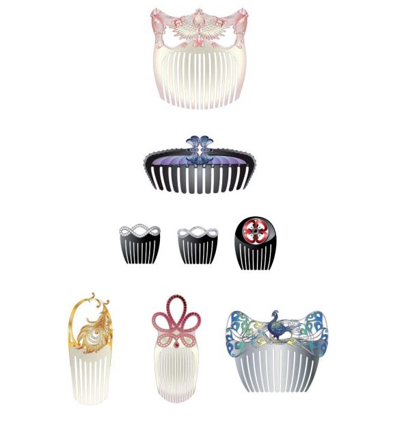 En Haute Joaillerie nous retrouvons aussi le bracelet, la bague et les boucles d’oreilles Vesta en or blanc et diamants ainsi que des parures de cheveux, renaissance des peignes chers à Lalique déjà rêvés en 1888 aux inspirations antiques et japonisantes. Là aussi les pierres s’associent dans un ballet de saphirs, diamants, turquoises, bakélites, corian, corne, nacre, argent, ors blanc et rouge.
