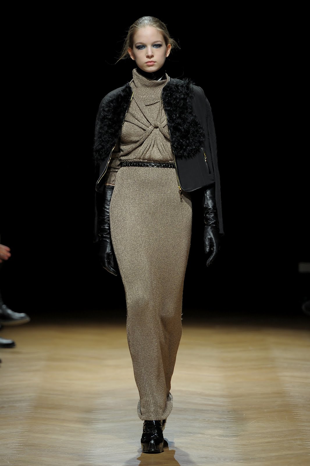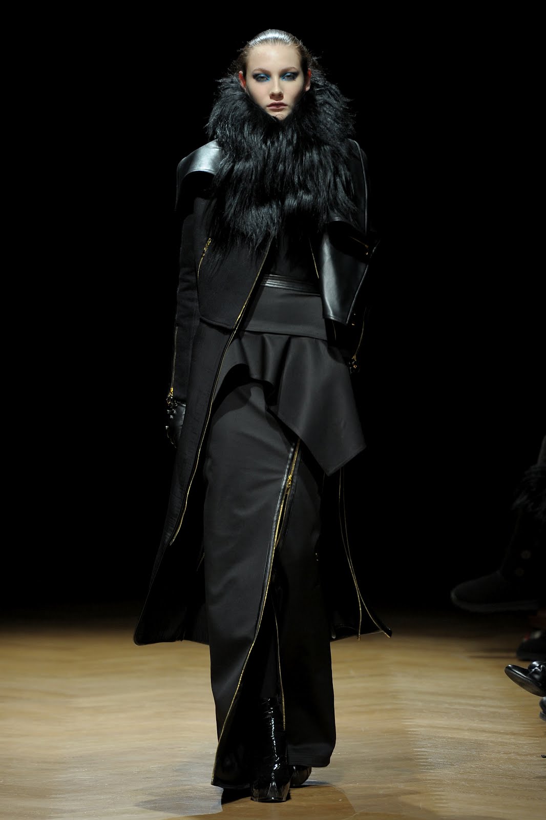 Le col est constamment porté haut lorsqu’il n’est pas orné de fourrure. La créatrice a choisi d’explorer plusieurs pistes, tentant parfois des looks rock/gothiques et d’autres beaucoup plus féminins. Elle orne au choix ses vêtements de clous mais aussi de bijoux (je garde à l’esprit un magnifique manteau blanc dont le dos était constellé de pierres). Elle joue aussi sur les superpositions de matières différentes et les mélanges de textures (matelassé/cuir, lamé/cuir ou fourrure).