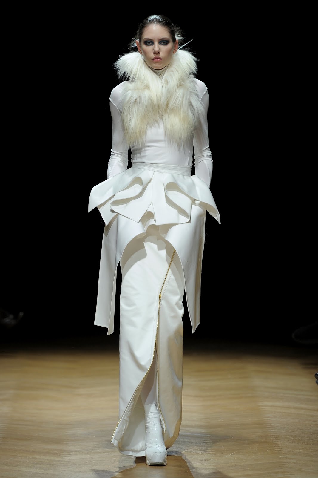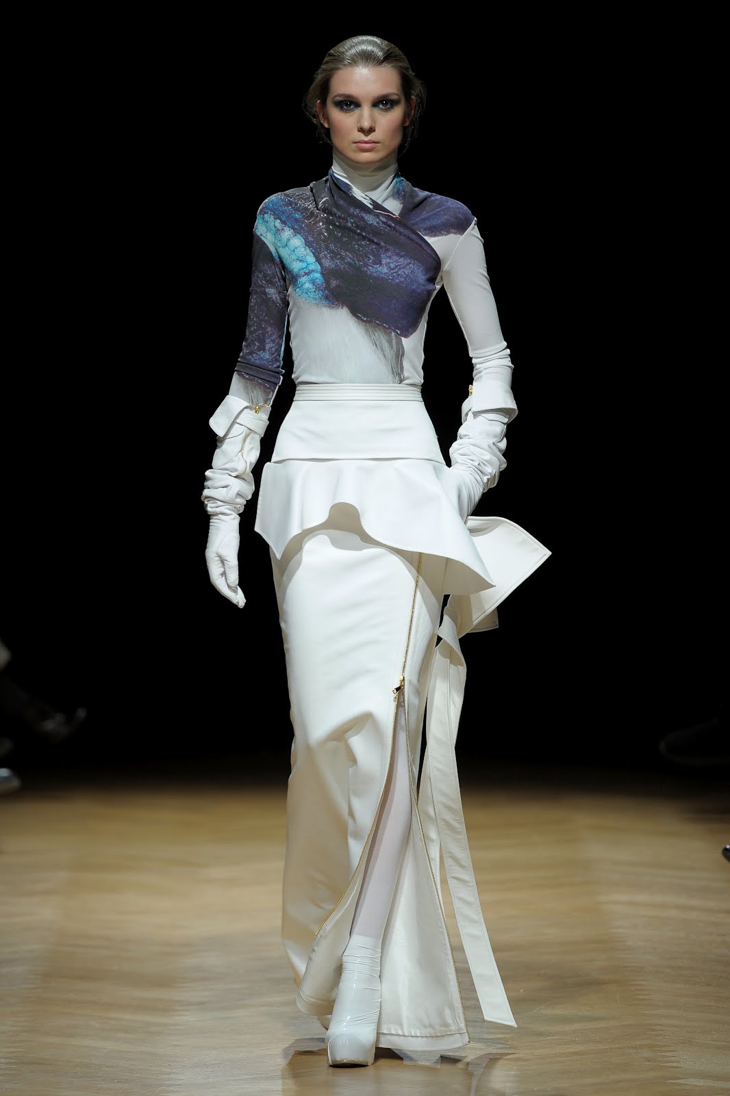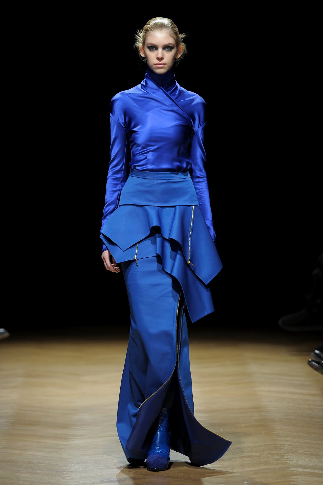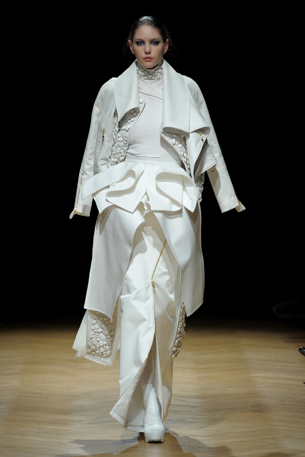 Les zips étaient à l’honneur lors du défilé, omniprésents et sorte d’armature de la silhouette, ils dessinent et accompagnent le mouvement. Les géométries sont très complexes, beaucoup de plissés et de drapés sur des matières qui ne s’y prêtent pas au premier abord (le cuir notamment) l’ensemble rappelant étonnamment, Marchesa, du point de vue de la technique. Les couleurs restent dans les tons de ce que l’on a déjà pu observer cette saison bleu électrique, blanc, noir, beige foncé…