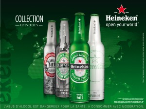 la première bouteille Heineken ; new York 1933, la première bouteille importée aux etats-Unis ; World 2012, la bouteille universelle ; The Future, la bouteille de demain.