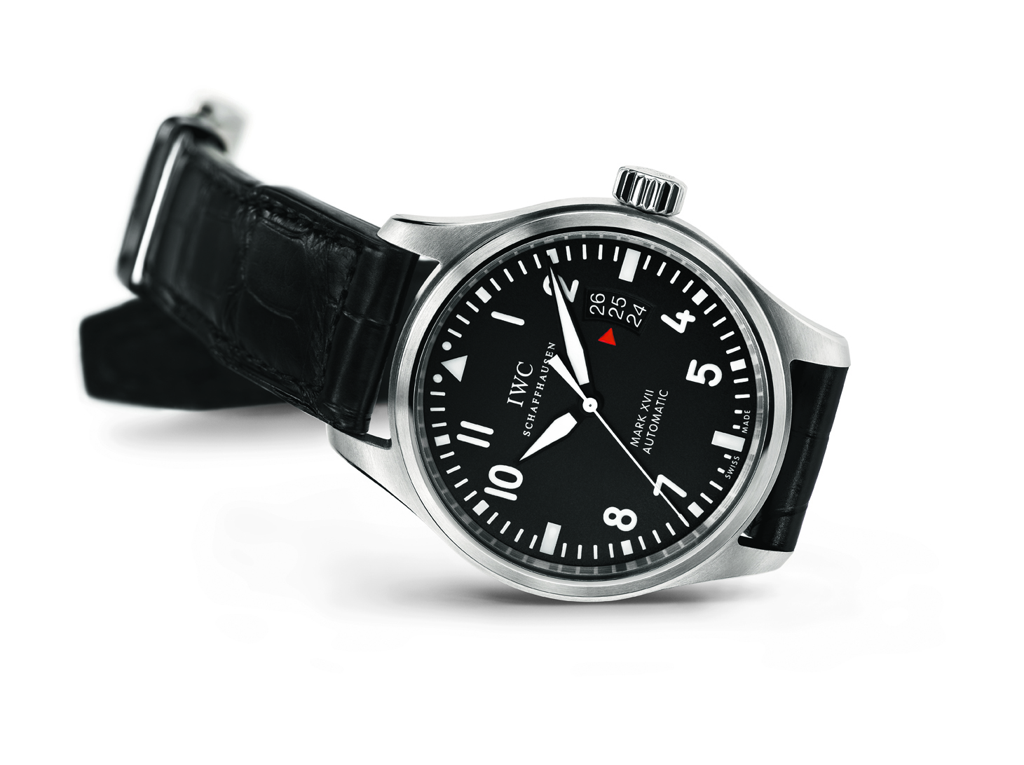 La version actuelle, la Montre d’Aviateur Mark XVII, trouve sa place avec bonheur dans l’esca- drille des Montres d’Aviateur IWC. Elle est dispo- nible avec un bracelet en alligator noir et boucle ardillon ou avec le nouveau bracelet en acier fin doté d’une boucle déployante avec mécanisme de fermeture de précision.