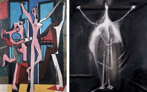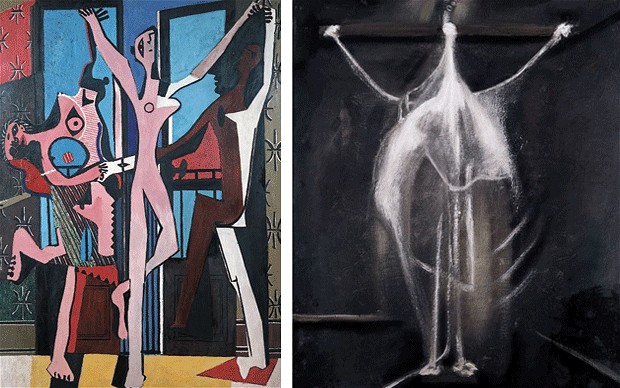 Parmi les œuvres de Picasso exposées figurent entre autres Tête d’homme (1913), L’Homme à la clarinette (1911-12), Trois danseuses (1925), Femme nue dans un fauteuil rouge (1932), Nature morte à la mandoline (1924), et bien d’autres, accompagnées en miroir des peintures ou sculptures des sept artistes britanniques sélectionnés. L’influence de Picasso s’est bien évidemment étendue bien au-delà de ces sept artistes, mais l’idée ici est de démontrer la profondeur et la diversité de cette influence. On y voit par exemple des Crucifixions de Francis Bacon, plusieurs sculptures de Moore ainsi que des dessins ou toiles hommages à Picasso par David Hockney.