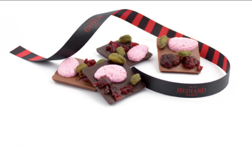 Ce printemps, Hédiard magnifie ses mendiants au chocolat avec des pistaches, des cranberries et une praline rose tels des joyaux précieux à déguster.