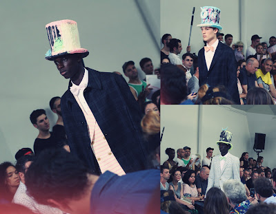 Cette année encore, Walter Van Beirendonck nous invite dans un univers éthéré et lugubre à la fois, propre à sa folie : tandis que d’un côté nous trouvons de fortes connotations à l’oeuvre déjantée Les aventures d’Alice au Pays des Merveilles de Lewis Carroll notamment par le biais des couvre-chefs : des haut-de-forme décalés et élégants, non sans rappeler le chapelier fou, personnage clef du roman d’apprentissage, nous pouvons aussi retrouver un univers plus inquiétant avec la tendance bondage abordée par le biais de harnais, parfois porté à même la peau. Walter Van Beirendonck opère ici une continuité avec son ancienne collection automne/hiver 2013 où là aussi, il abordait des aspirations SM par des références et clins d’oeil avec sa fameuse ligne de masques. On retrouve évidemment en pièces phares de la collection la chemise retournée et la chemise à plastron, la teinte pastel omniprésente sur ses costumes, une belle gamme de noeuds papillon, mais aussi des chaussettes montantes et de la ganterie marquée par le nom de la marque. Blanc sur noir. Quant au set musical, il accentuait à la perfection l’image que voulait véhiculer le créateur belge : un homme élégant, décalé, inquiétant et mystérieux. Shaun Ross, mannequin albinos très célèbre et modèle pour le défilé, incarnait à merveille cet homme froid et déluré à la fois.