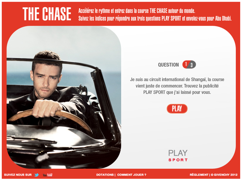 A cette occasion, la marque organise actuellement un jeu-concours #thechase sur sa fanage et sur twitter http://www.facebook.com/parfumsgivenchy