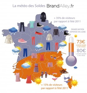 Suite à la météo maussade et parfois fraiche et pluvieuse que nous avons subi lors des 3 premières semaines des soldes d’été dans la moitié nord de la France, Brandalley a analysé ses chiffres pour le bilan des soldes d’été, afin de mieux comprendre les comportements d’achat sur internet face à la météo.