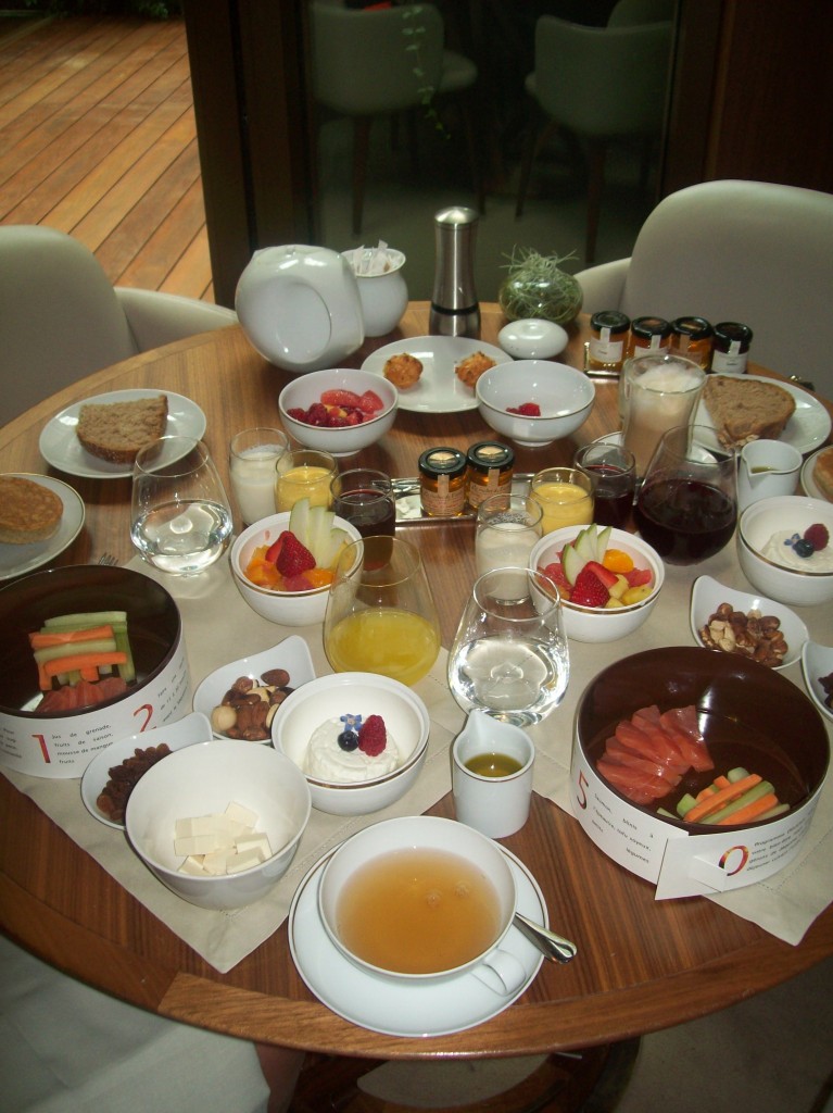 Tout un programme de saveurs, de couleurs, de sensations : thé vert au Jasmin, jus de carottes frais, jus de grenade, smoothie de mangue, lait d’amandes, fruits de saison, noix et amandes nappées de miel, cottage cheese 0% accompagné de pain complet imbibé d’une délicieuse huile d’olive qui sent la Provence, galettes d’épeautre faisant office de blinis pour le saumon frais…