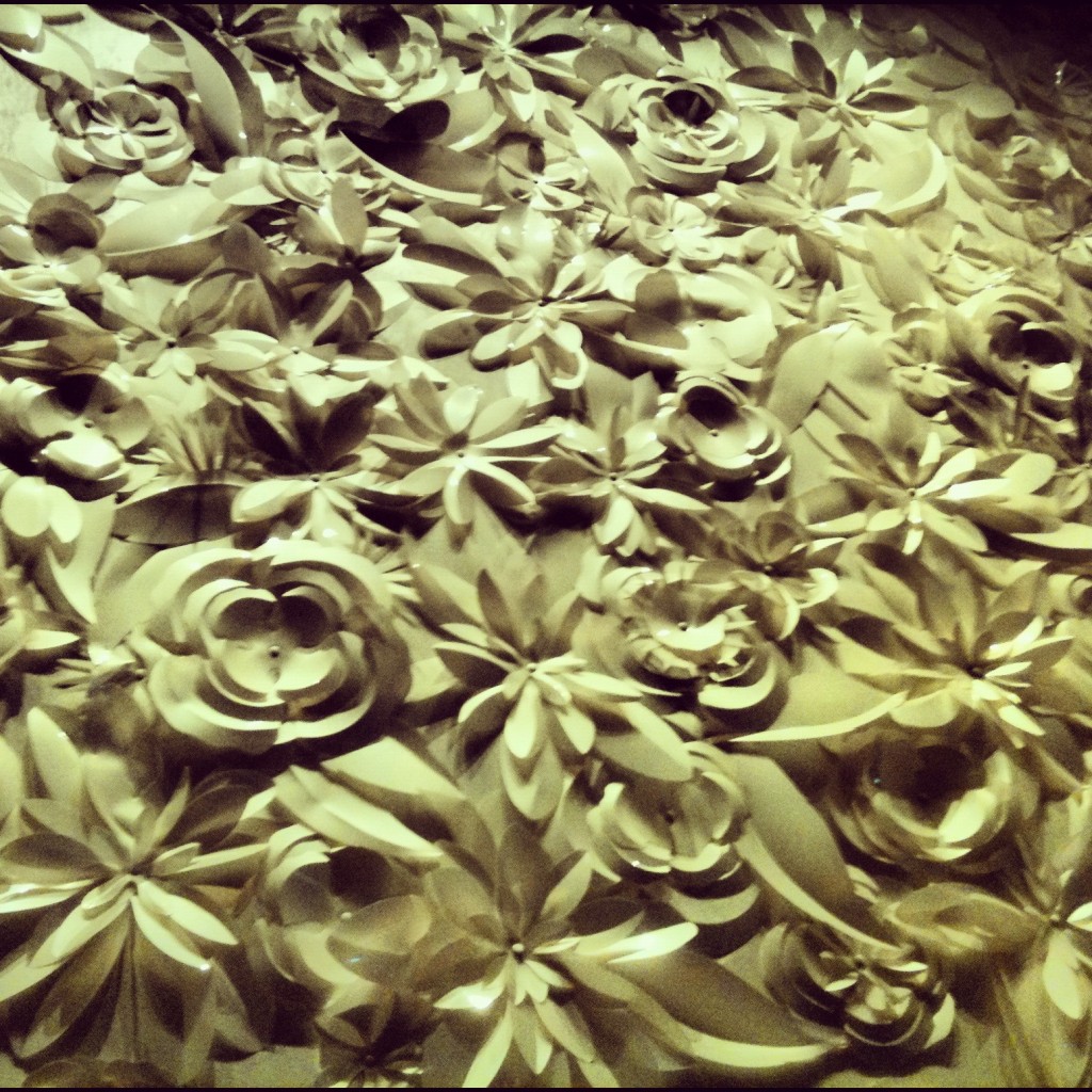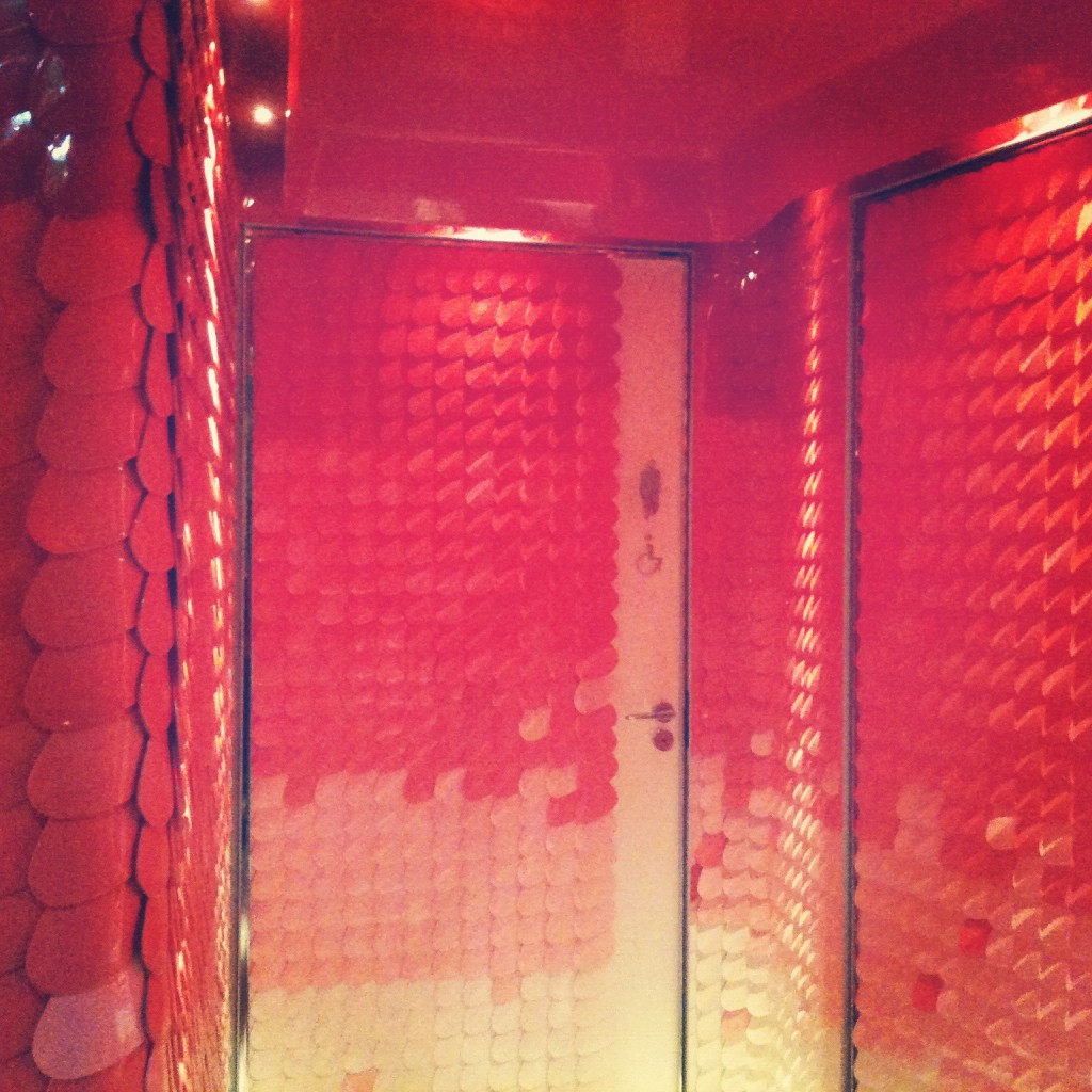 Si vous y venez, ne ratez pas la touche colorée dans les toilettes du restaurant, aux effets et reflets brillants des pétales rouges en vinyle.
