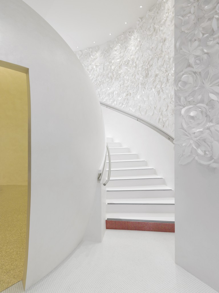 Cet étonnant restaurant a été conçu comme un cocon, tout blanc, très intimiste, sans musique d’ambiance et décoré d’un mobilier et d’une vaisselle entièrement réalisés « sur mesure » en collaboration avec le Chef.