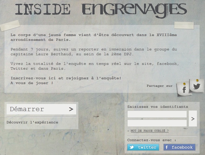 Autre projet parallèle très intéressant : Inside Engrenages. A l’occasion du lancement de la saison 4 d’Engrenages, Canal+ a mis en ligne depuis le lundi 27 août sur son site une websérie basée sur l’univers de la série et baptisée « Inside Engrenages ». La chaîne propose donc à l’internaute de suivre en temps réel, et pendant 7 jours, un webreporter en immersion dans une enquête interactive, à la fois sur son site et les réseaux sociaux. Il s’agit d’une intrigue originale réalisé avec des moyens très importants pour ce genre de projet. Canal se montre une fois de plus à la pointe.