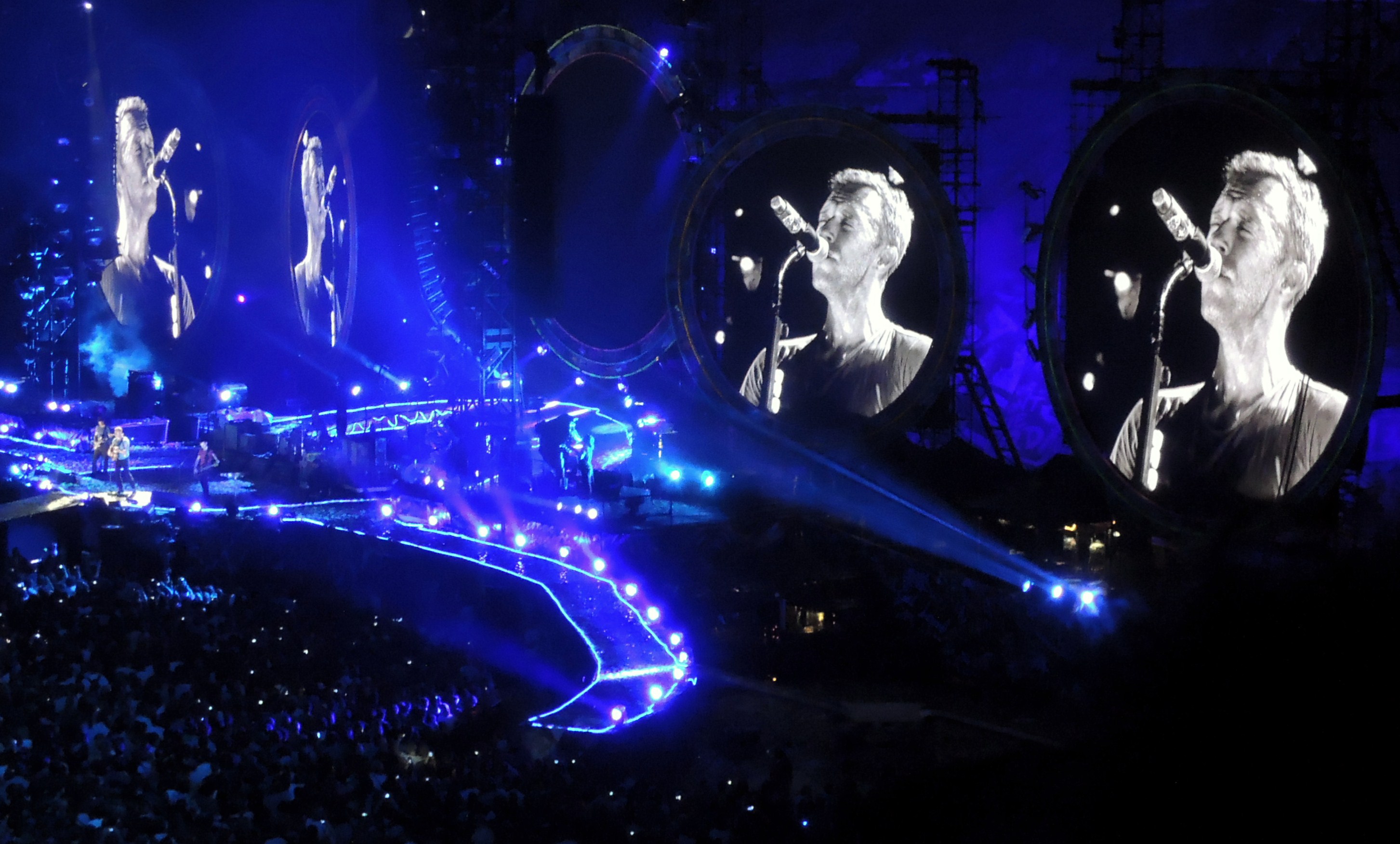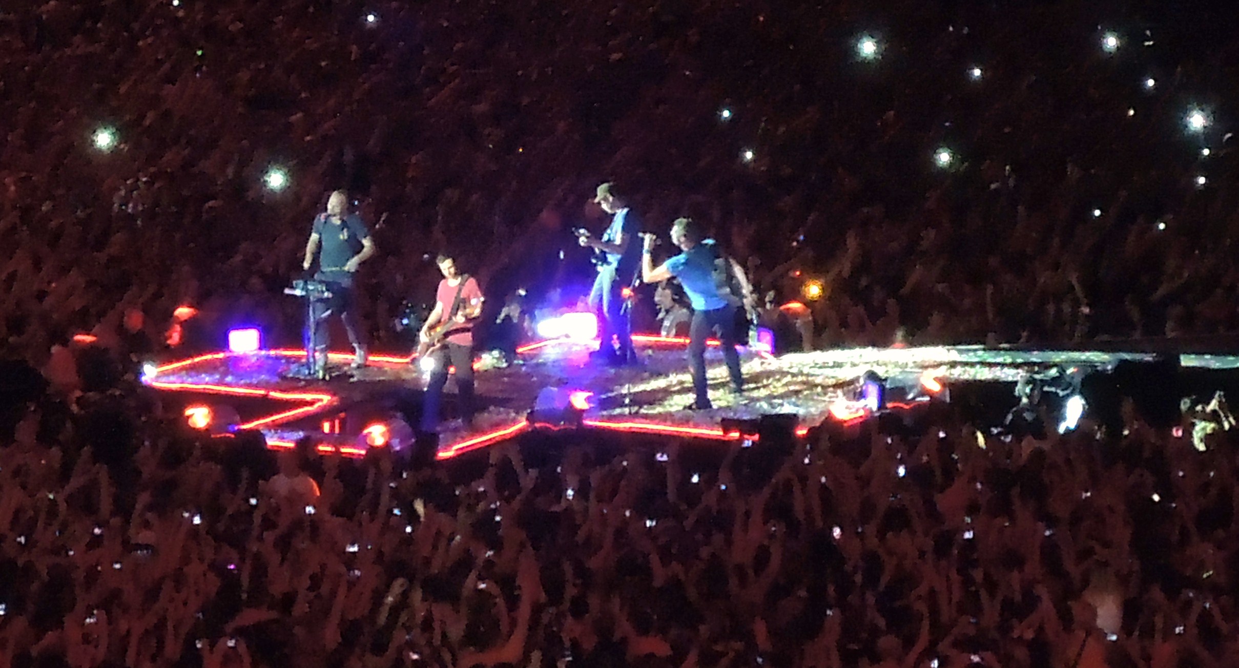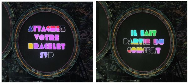 A l’arrivée au stade, chaque spectateur a reçu deux bracelets colorés, de la marque Xylobands. Apparemment, Coldplay a l’habitude de les utiliser (précédemment à Bercy et également dans un de leurs clips, Charlie Brown, extrait de leur dernier album Mylo Xyloto) Marqués du logo Twitter et du hashtag #COLDPLAYFILM, cela confortait l’idée que le concert serait filmé, sans doute pour le DVD de la tournée. Mais la surprise, c’est quand un stade entier se pare de mille feux, lorsque les bras se lèvent et s’illuminent de bleu, rose, jaune, vert, blanc, grâce aux LED radio-contrôlées. Quand la technologie se met au service d’un show, ça vous laisse sans voix et c’est sublime !