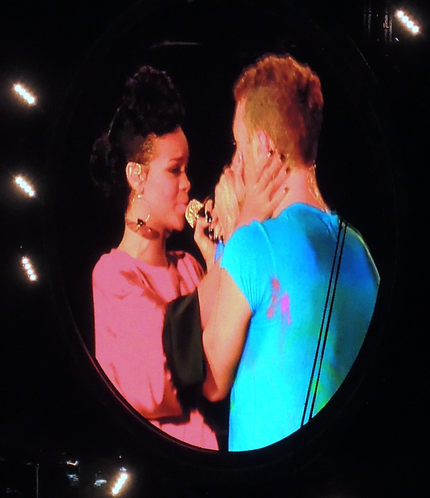 La rumeur de la présence de Rihanna en guest s’était confirmée la veille, quand la star avait commis un « fail » sur Twitter; indiquer à ses 25 millions de followers qu’on prend l’Eurostar à Londres et s’étonner qu’une foule en délire l’attende à son arrivée Gare du Nord à Paris… la jeune chanteuse de 24 ans douterait naïvement de la puissance des réseaux sociaux ? En tout cas, elle était bien au rendez-vous pour interpréter le titre « Princess of China » avec Chris Martin, et même à deux reprises. Joli duo, une vraie complicité artistique.