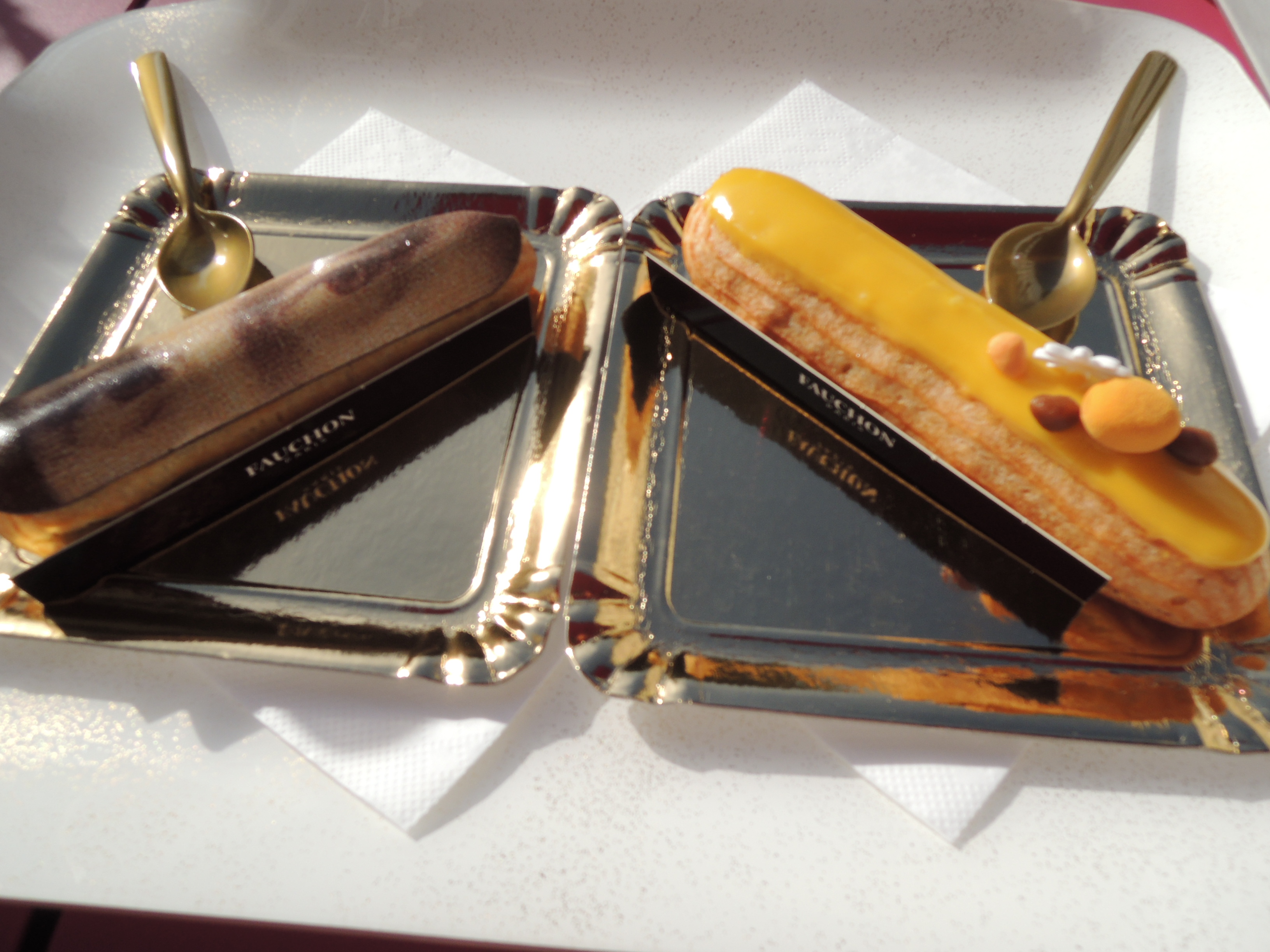 Il nous aura fallu quelques minutes d’observation, de questions, d’émerveillement et de négociation pour choisir ces deux recettes qui se marièrent délicieusement. Sagement assis en terrasse, après de longs moments à se délecter du plaisir visuel procuré par ces pièces d’art, nous osâmes plonger notre cuillère dans les éclairs. Le chocolat crémeux, tout autant que croustillant, de la Joconde et de sa coque au chocolat, s’équilibra parfaitement avec la douceur fruitée du mangue/banane. Doucement, délicatement, nous prirent le temps de ces quelques bouchées… accompagnées d’un café Moka et d’une eau « agitée ».