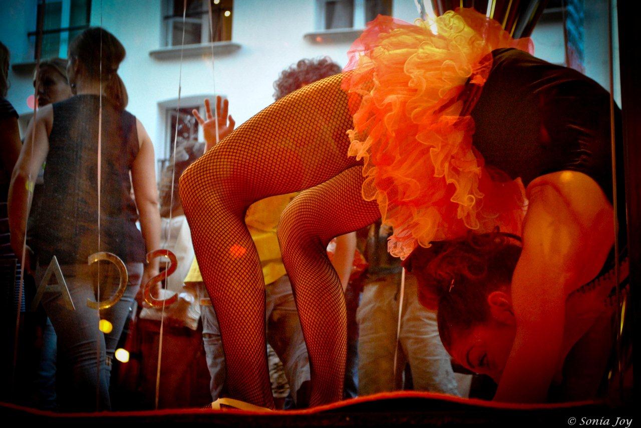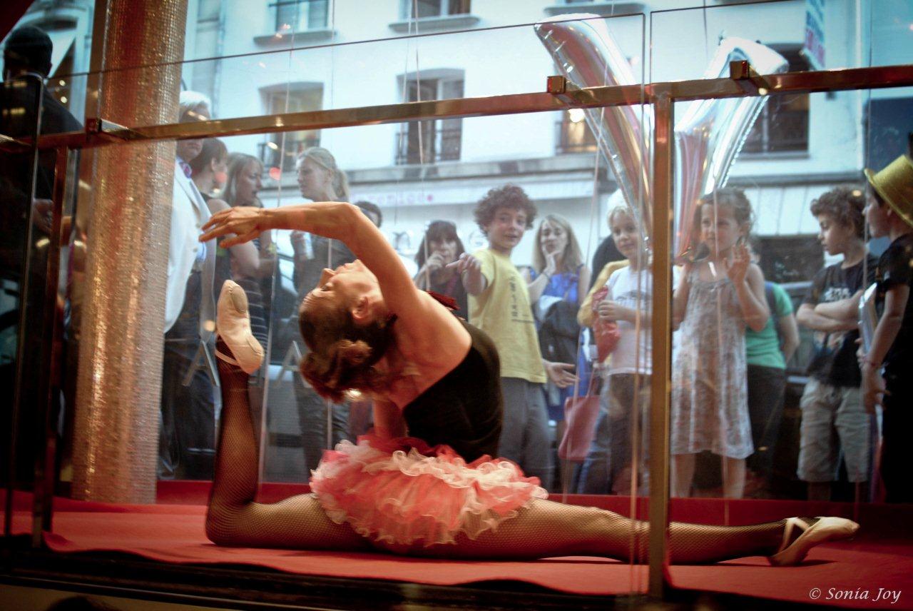 Les artistes de la compagnie « Les coureurs de Toit » ont animé les vitrines toute la soirée au travers de numéros de contorsionnistes, de jonglages, de cerceaux, de portés… aux rythmes de la Fanfare « Ouaiscecool » (installée dans une autre vitrine) reprenant les grands standards de musiques de film et de cirque. Le spectacle était autant dedans que dehors, où la foule médusée applaudissait.
