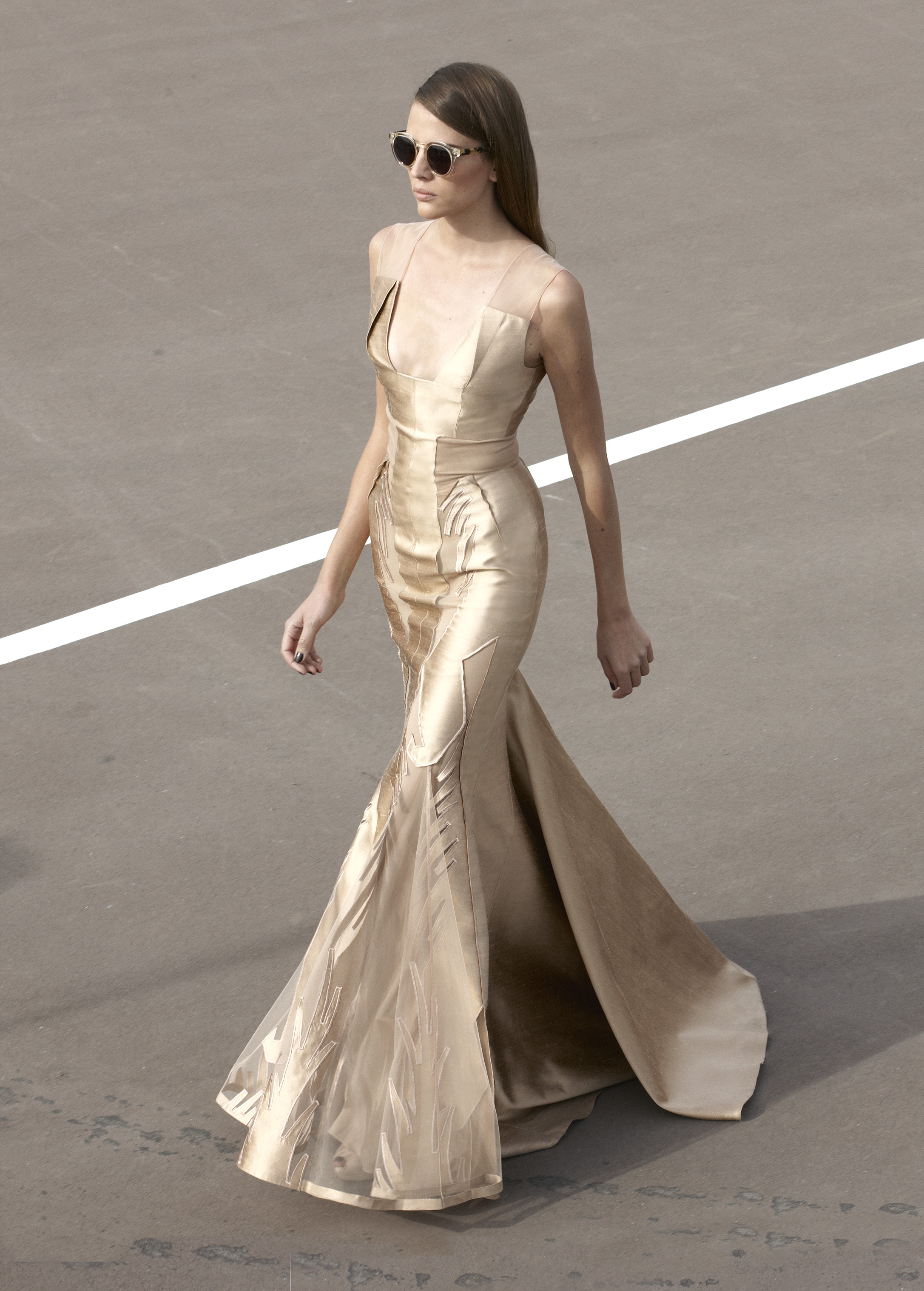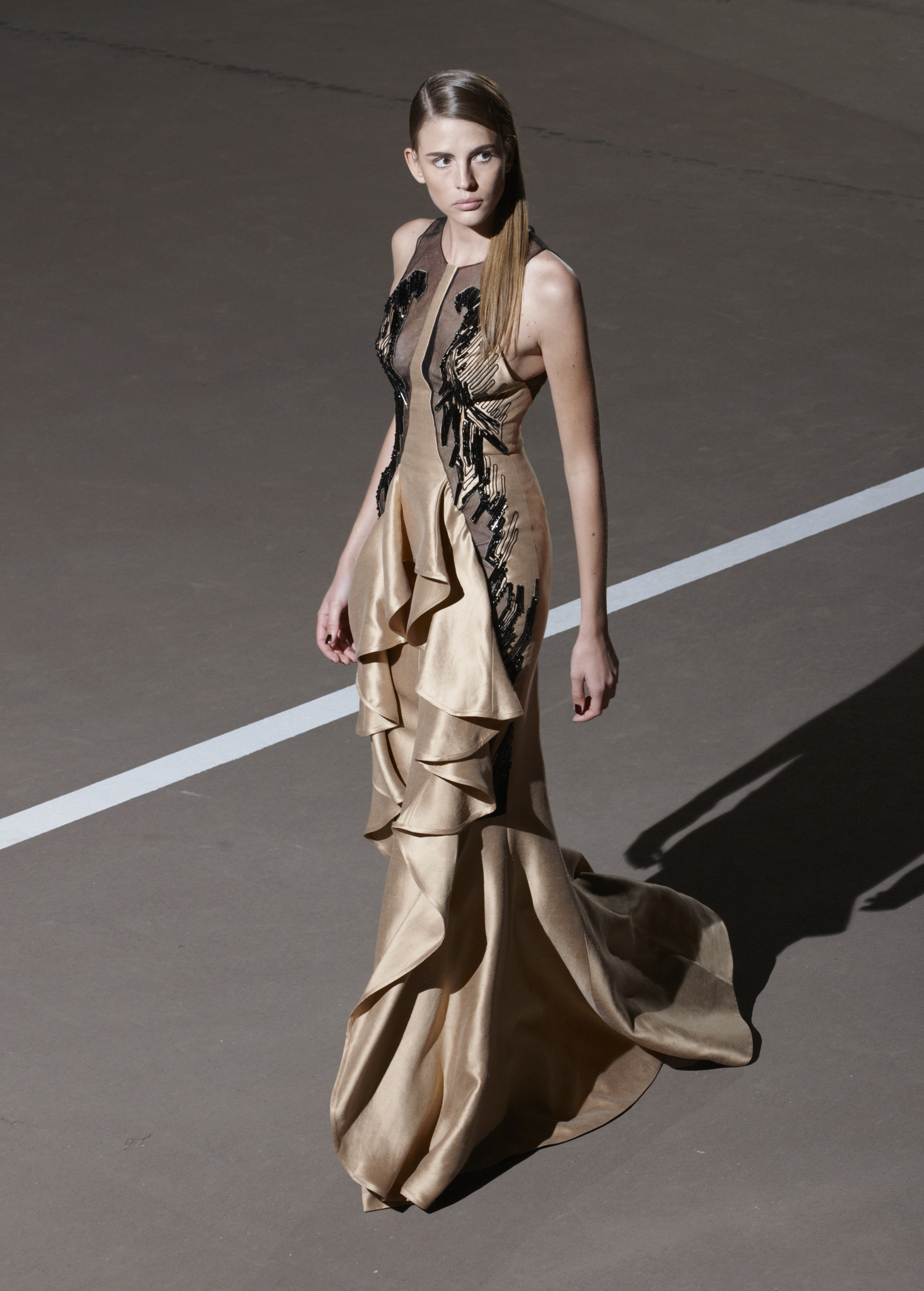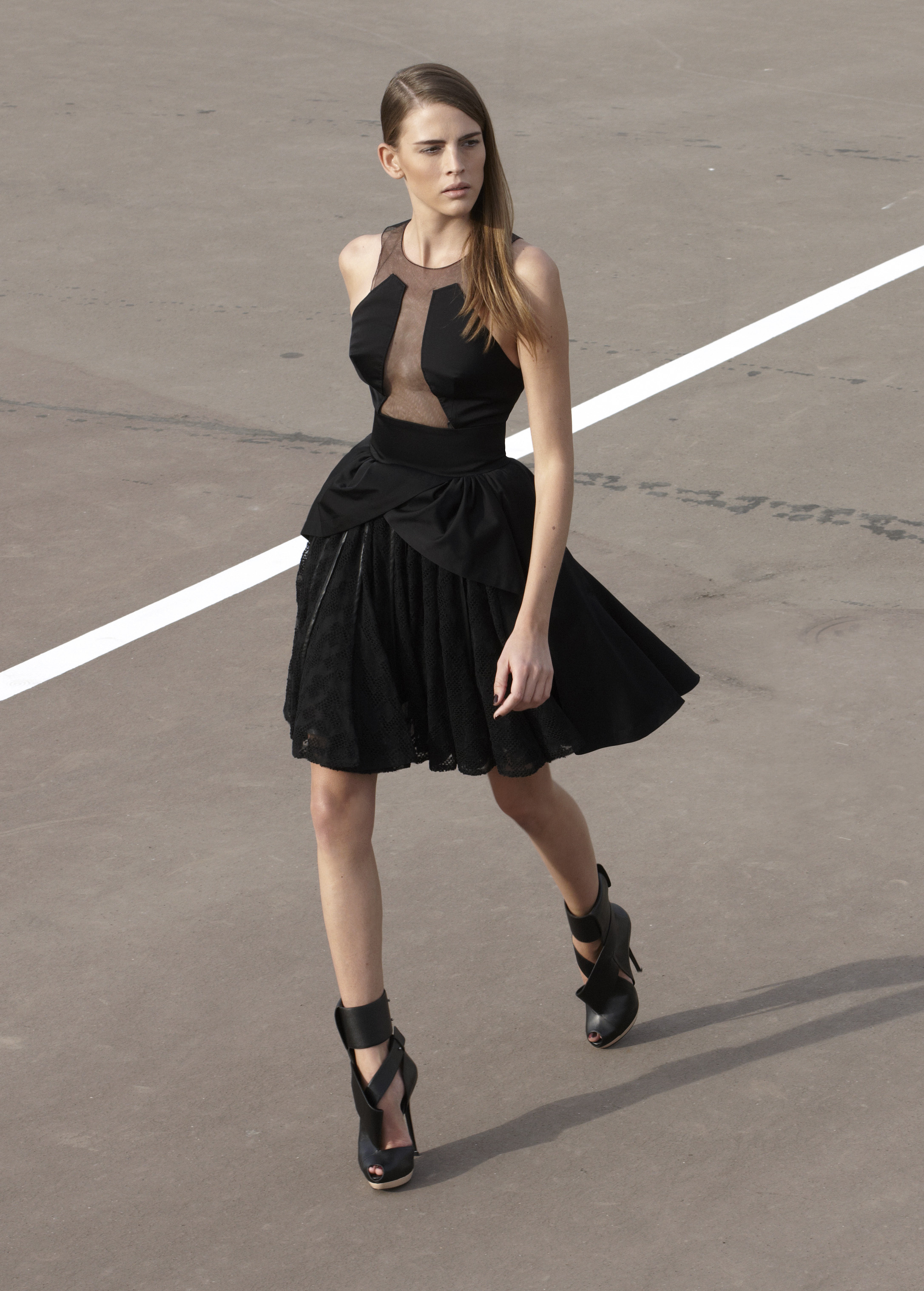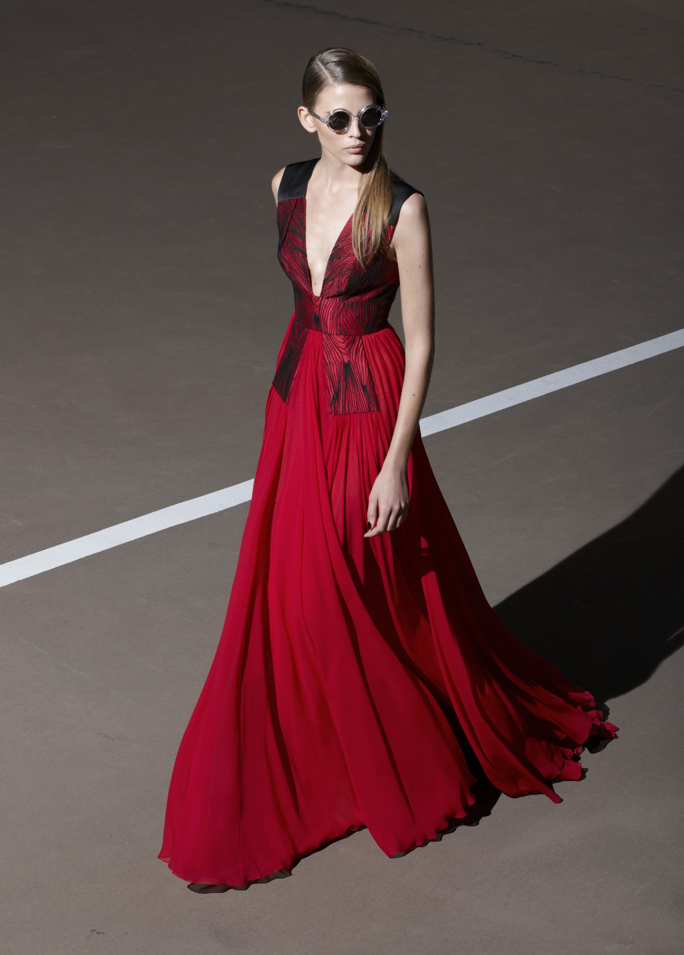 Les silhouettes longilignes, graphiques, ultra féminines de la collection printemps 2013 rappellent les femmes à l’ordre ! Ne rien céder sur la féminité, oser, jouer, transcender le vêtement pour en faire un accessoire du corps. Court ou long, la géométrie s’impose autour de jupes ouvertes, la fluidité se dit dans les matières douces et souples, le corps se révèle dans des coupes qui valorisent les épaules, le port de tête, les jambes interminables. La collection met un coup de projecteur sur la volonté évidente de travailler le vêtement sur le corps ainsi modelé, sculpté, toujours en volume et en mouvement. Les robes glissent, sensuelles et conquérantes, les volants créent la surprise, les couleurs font l’allure, l’argent réfléchissant, le bleu azuréen, le noir profond… Imprimés et broderies parsèment les robes et structurent la forme, dessinant l’axe central de l’équilibre ! Des découpes, des transparences, des jeux de longueur, l’audace féminine est au rendez-vous de l’élégance.